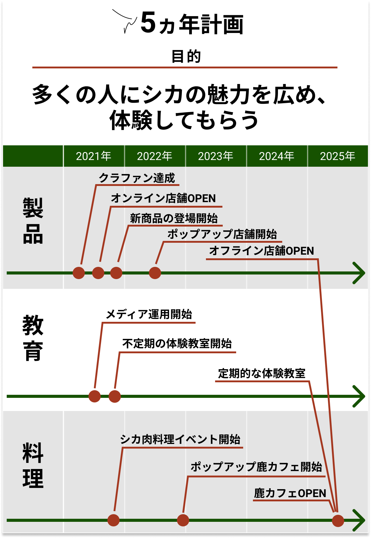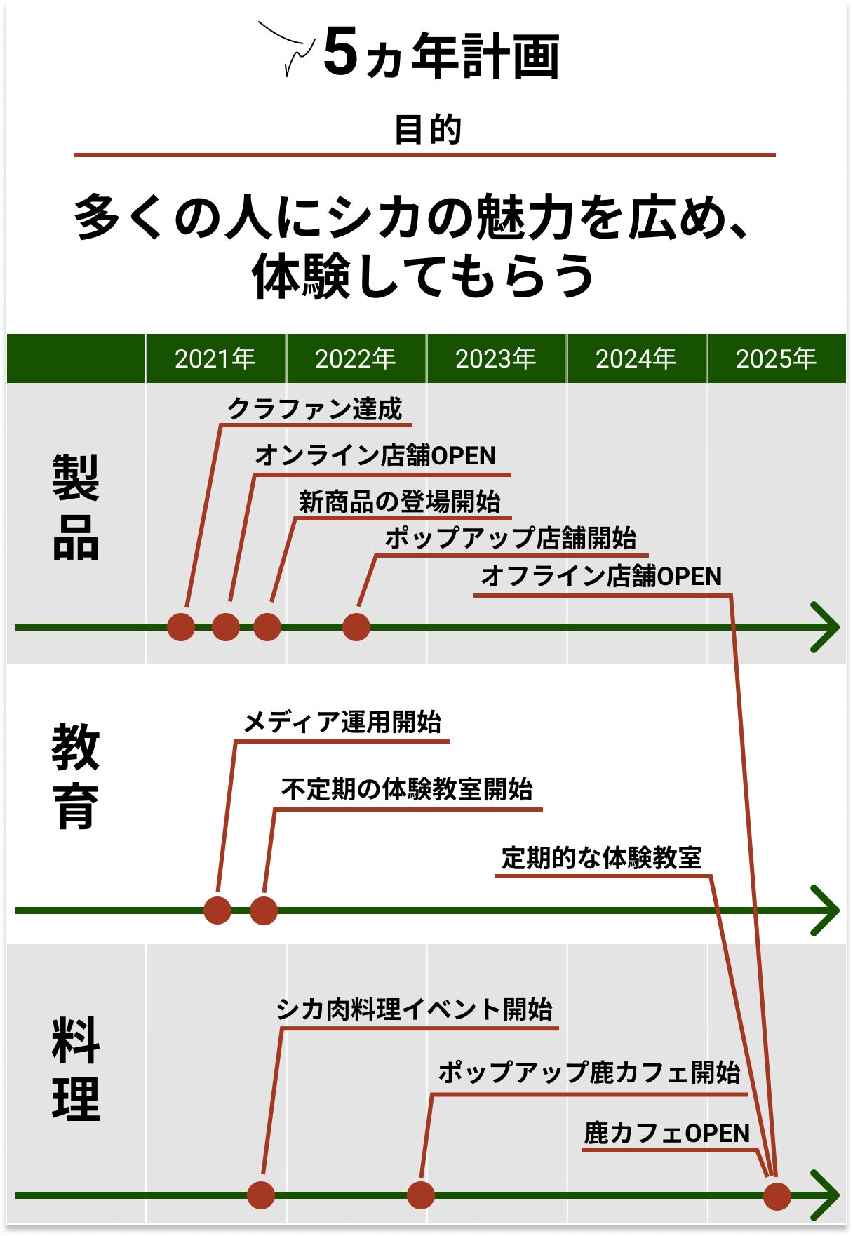 この製品をきっかけに、少しずつ体験が広まっていけば、廃れてしまった”シカ“という日本の文化を復興させることができます。さらに、過疎化していく地方で“害獣”と呼ばれてしまう“厄介者”を価値に変えることで、地方にお金を流して元気を与えることができます。さらにさらに、そうなれば2500億円の税金を使って進められているシカの被害対策も、市場からのお金によって、持続可能な対策へと変わっていきます。そして最終的には、いただいたシカの命を無駄にしない、命に責任を持つ社会を作れると信じています。