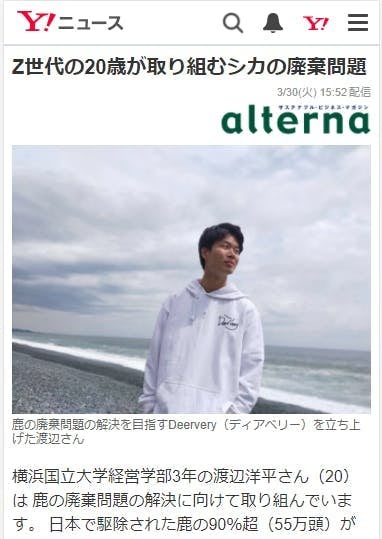 こんにちは!シカ起業家の渡辺洋平です。自然豊かな北海道で育った、横浜国立大学に通う20歳の学生です。
