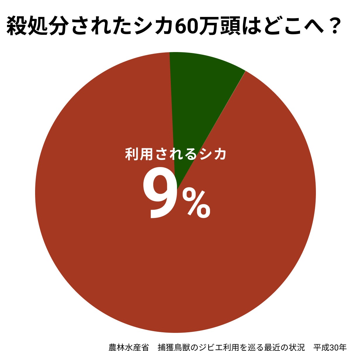 そこで調べてみると、シカがとても増えていて、農業や林業、生態系や交通関係にとても大きな被害を与えていることを知りました。さらに、毎年約60万頭のシカを駆除をしていることを知りました。(環境省「ニホンジカ・イノシシ捕獲頭数速報値(令和元年度)」より)