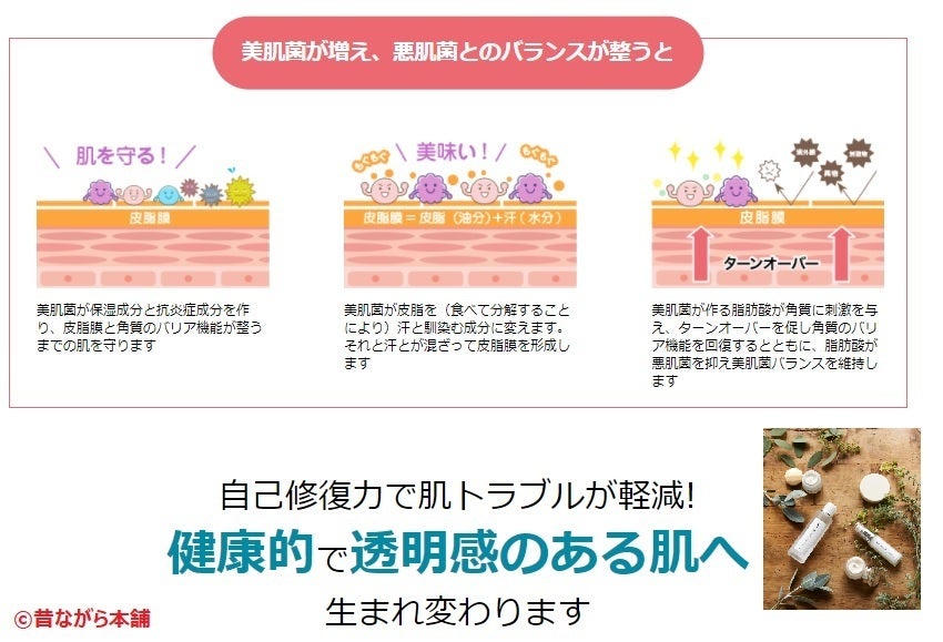 常在菌と言えば、腸内細菌。腸内細菌といえば善玉菌というように多くの人が知るようになりました。そして、善玉菌が人々の健康に寄与することも知れるようになりました。我々の肌も皮膚常在菌が守ってくれています。善玉菌が皮膚では美肌菌と呼ばれています。美肌菌とその他の菌がバランスを保つことにより、適切な皮脂膜が作られます。この天然のバリア成分である皮脂膜は一般化粧品クリームの100倍ぐらいのバリア機能があります。このバリア機能が世の中にあふれる合成界面活性剤で破壊され、様々な皮膚トラブルを起こしています。紀元前3000年ごろにできたと言われる石けんが美肌菌を育み、安全安心なことは歴史が証明してくれています。