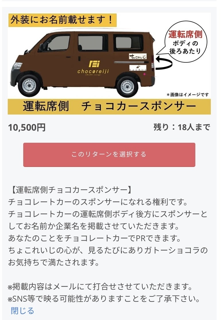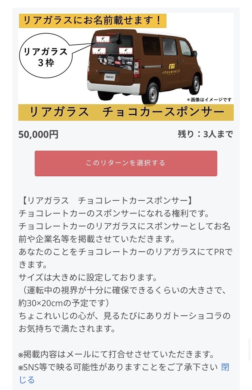 先にチョコカースポンサーをご購入下さった方を優先させて頂くため、運転席側で、かつ料金が少し割高となっておりますことをご承知下さい。