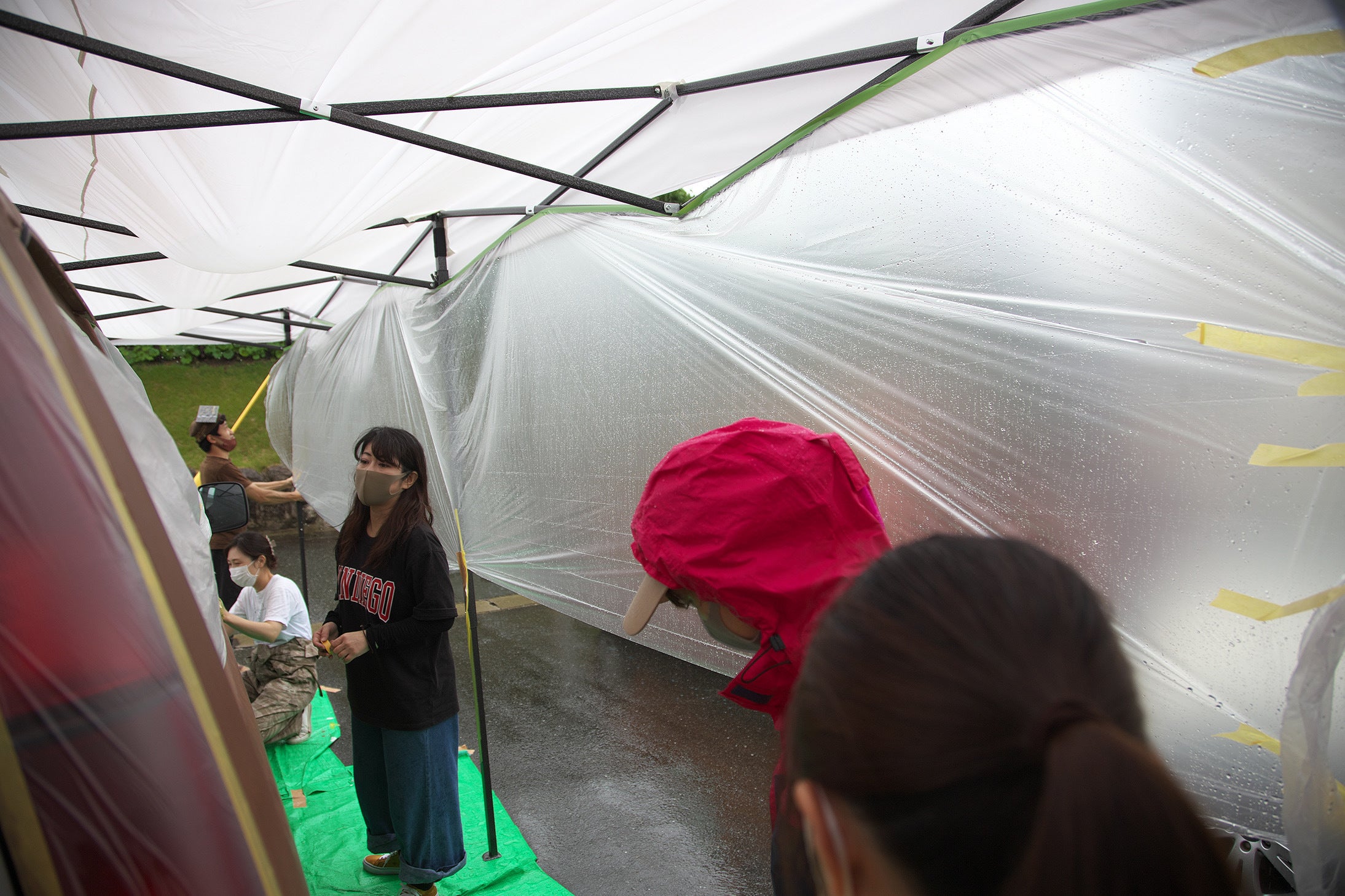 あいにくの雨でヤバすぎると思いながら、テントを貼ったり、養生しながらなんとか決行しました。
