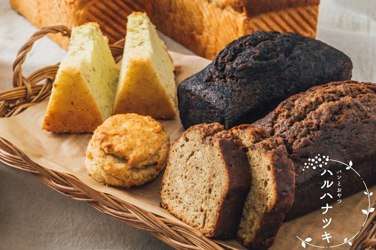 食パン「ハル」+パウンドケーキ+お楽しみのパンとおやつの詰め合わせになります。