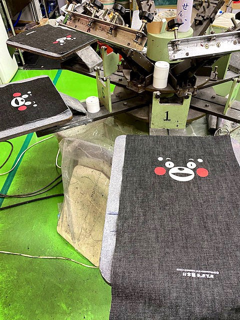 ブラックデニムにはっきりとした白と赤のインクでくまモンの顔が映えます。