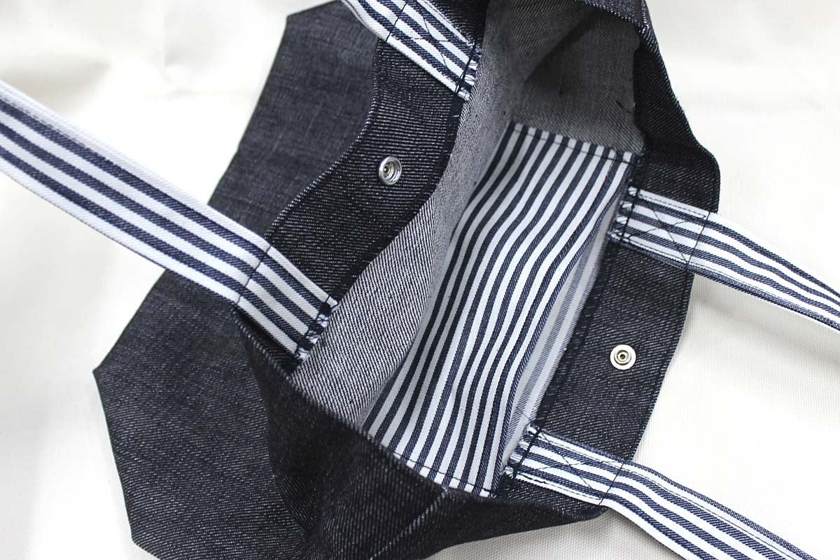 紐は、ストライプのデニムを使用しています。