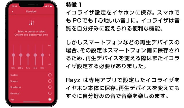 Rayz は専用アプリで設定したイコライザをイヤホン本体に保存。再生デバイスを変えてもすぐに自分好みの音で音楽を楽しめます。