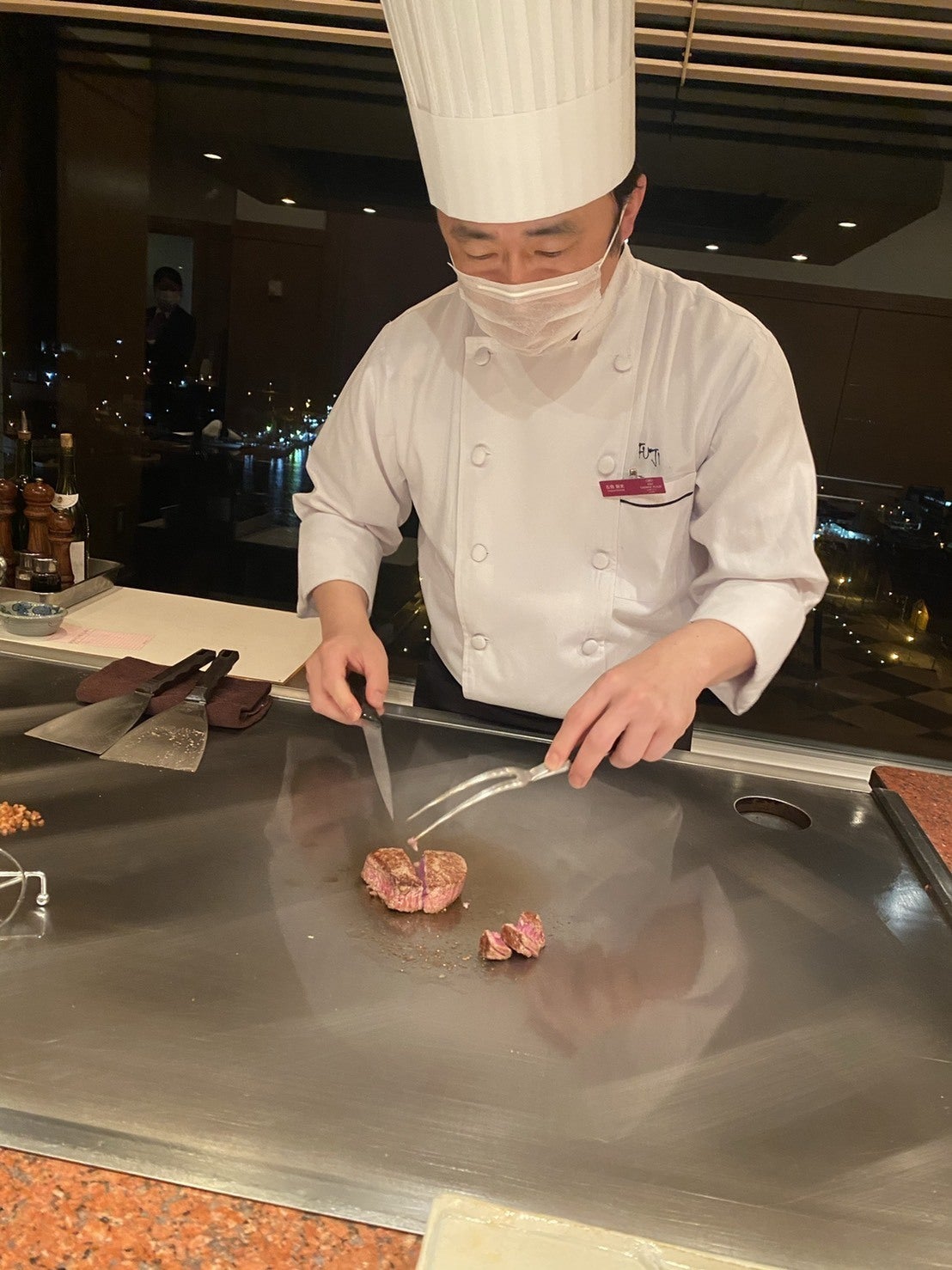 洋食レストランから鉄板焼き屋に異動になったとき、最初はお好み焼きか何かと思っていました。行ってみると、中庭のある和の雰囲気のホールに、ぴかぴかのステンレス製鉄板がいくつもあるのに驚きました。諸先輩方の焼いている姿はとても格好よく、凛としていて、所作はとても美しいものでした。