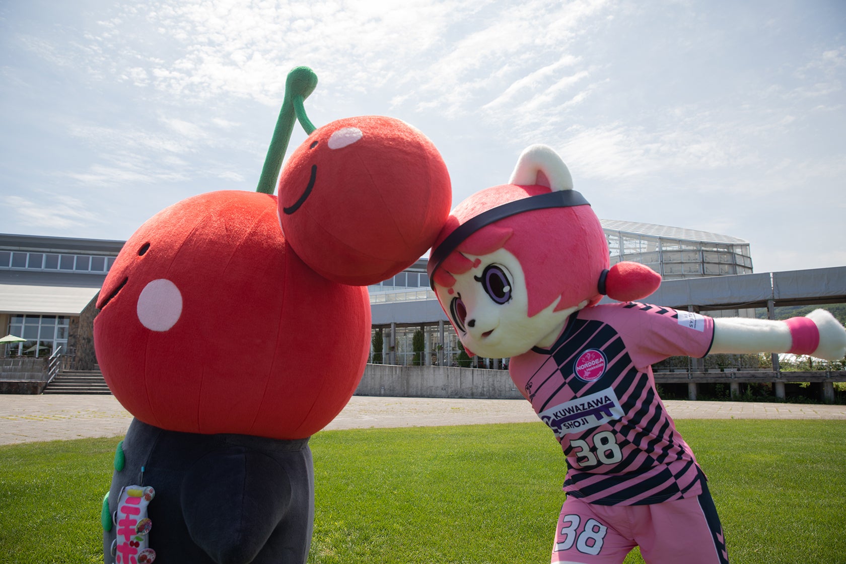 仁木町では「農村公園フルーツパークにき」で「ニキボー」がお出迎えしてくれました!ポスターを渡してPRした後は一緒にさくらんぼ狩りをして仁木を満喫!こらこらノルちゃんタケボー(ニキボーの横の小さいさくらんぼ)はボールじゃないよ!!