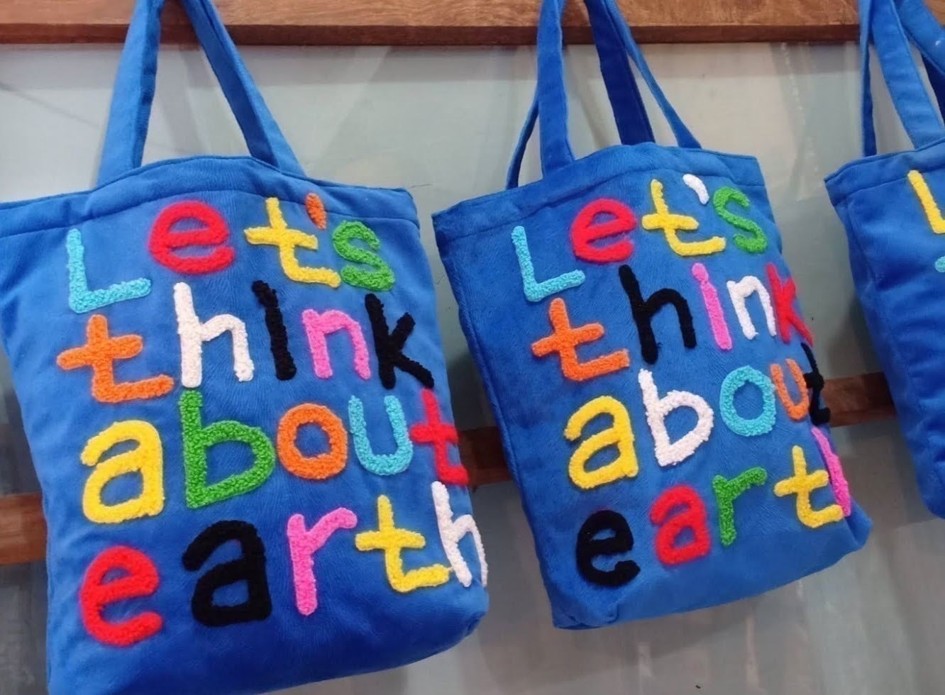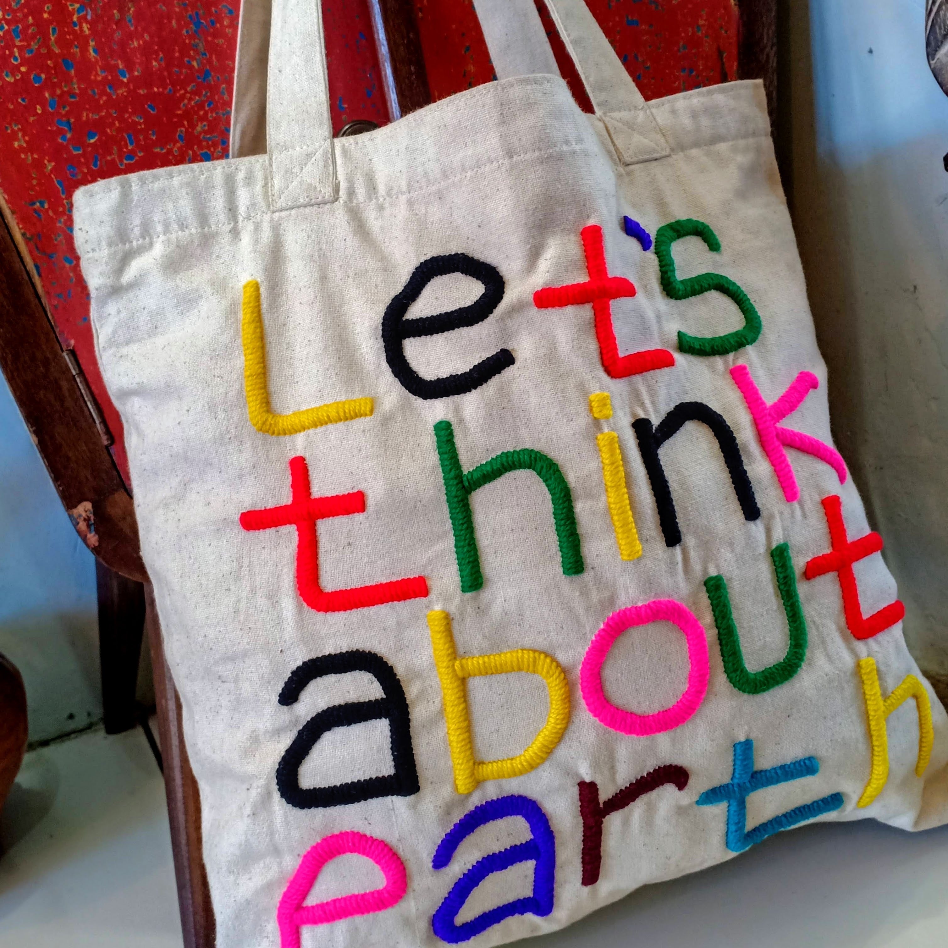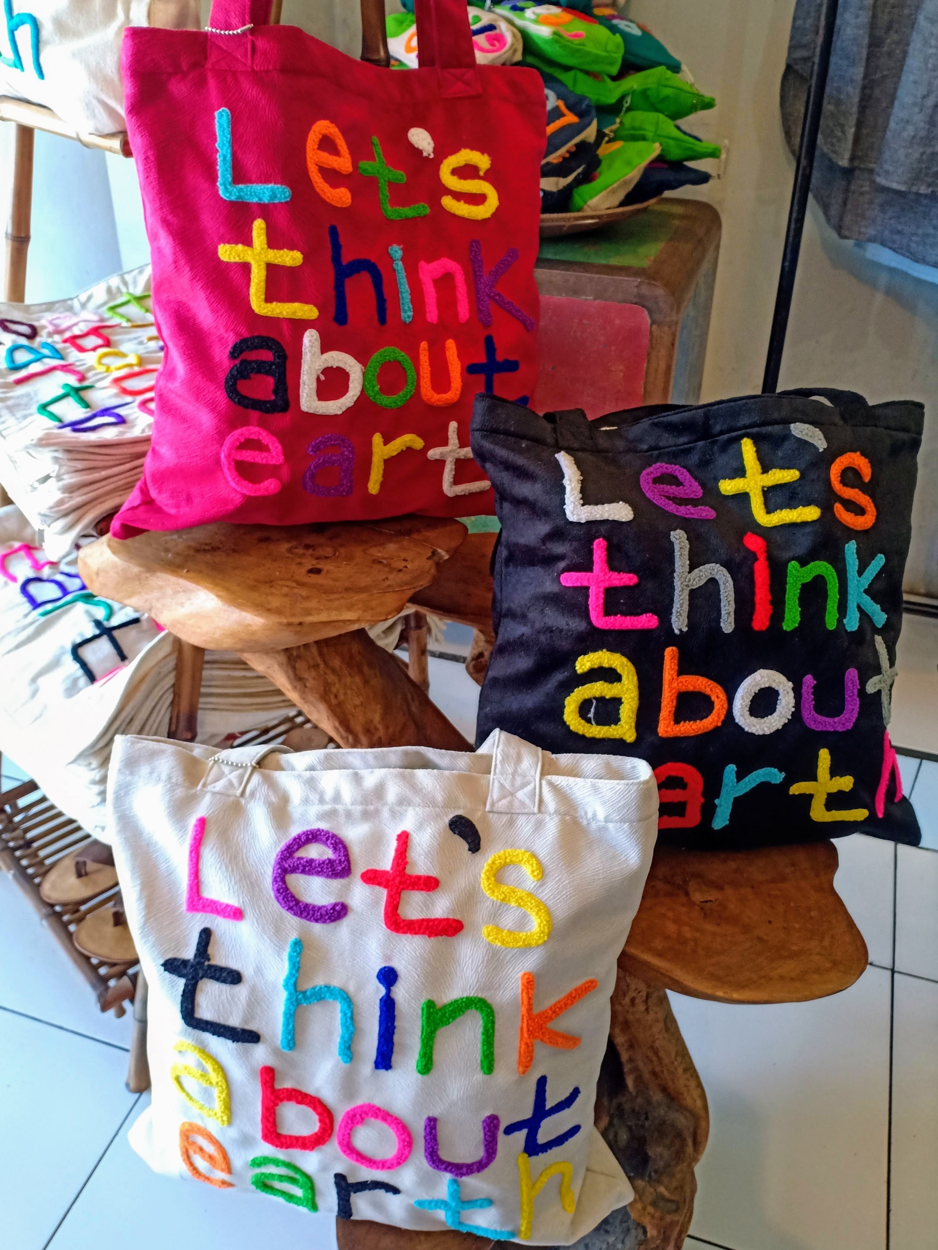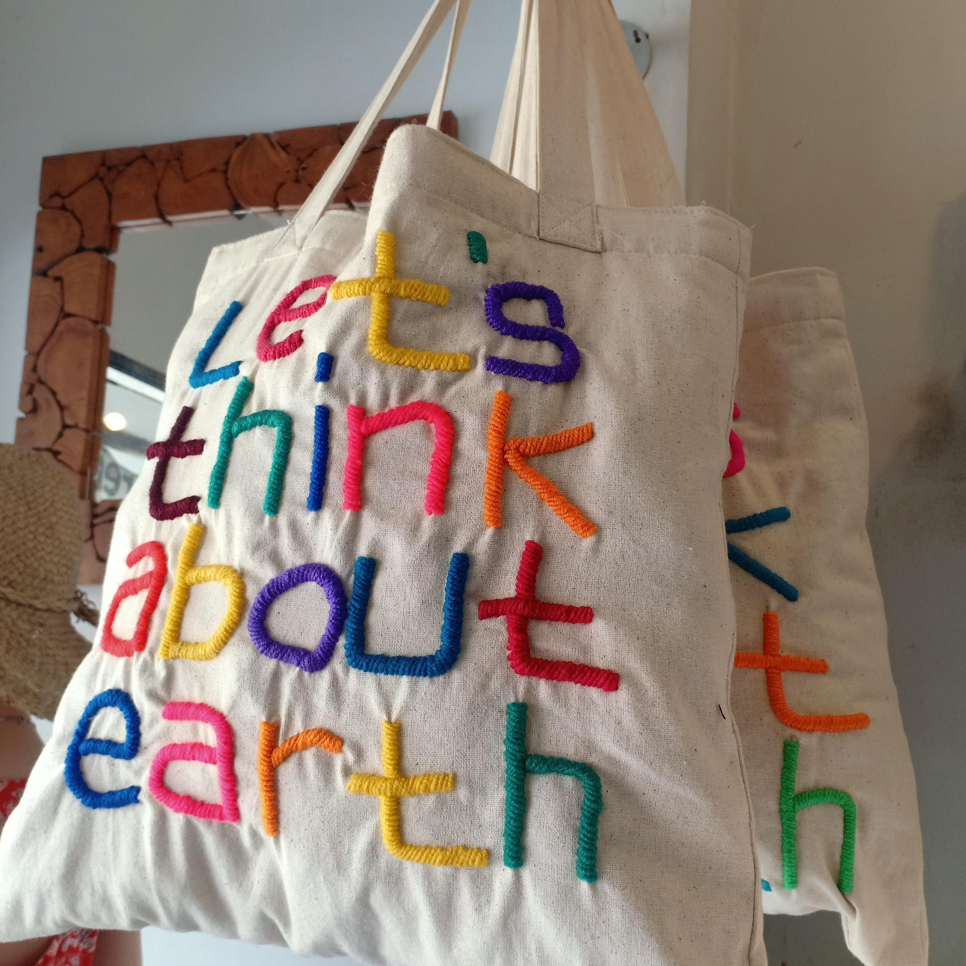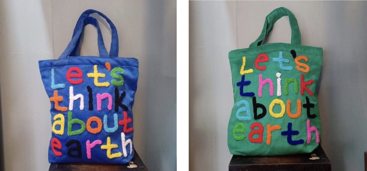 オーナーのメッセージ (Let’s think about earth) が込められたカラフルな刺繍で施されたバッグを手にした時、作り手の温かみが感じ伝わってきました。