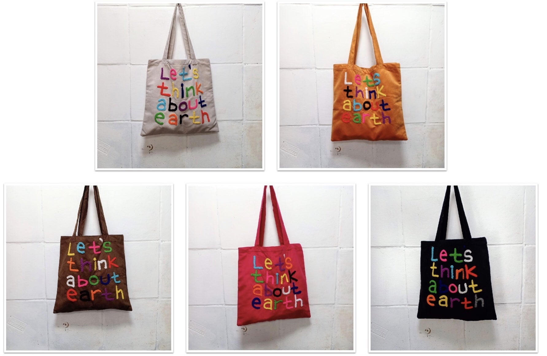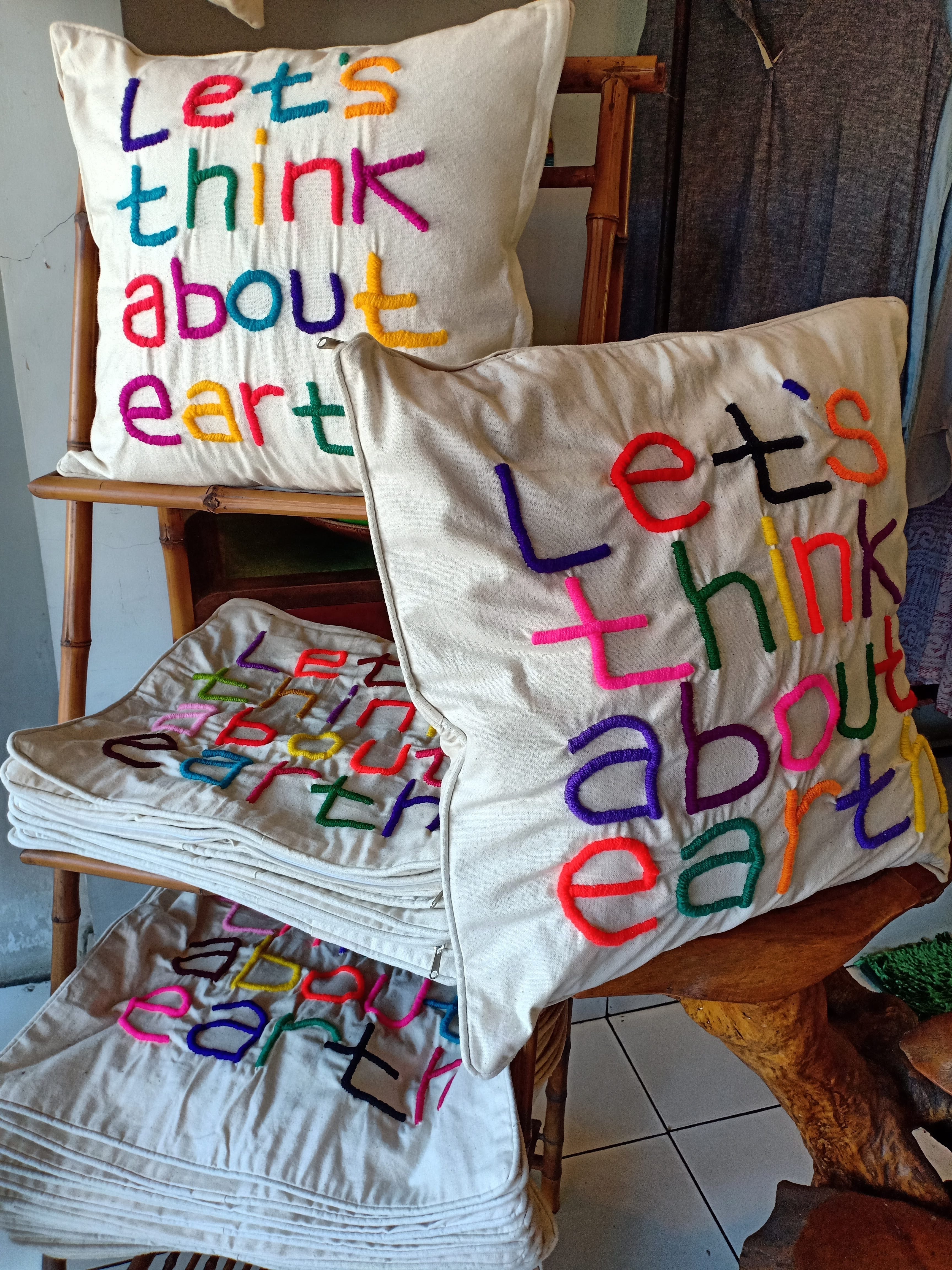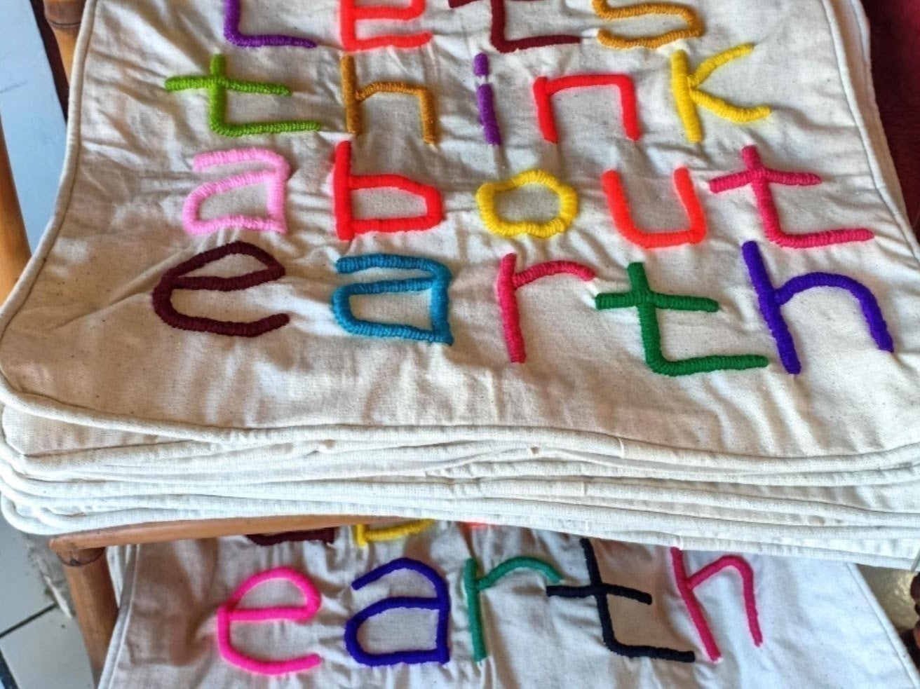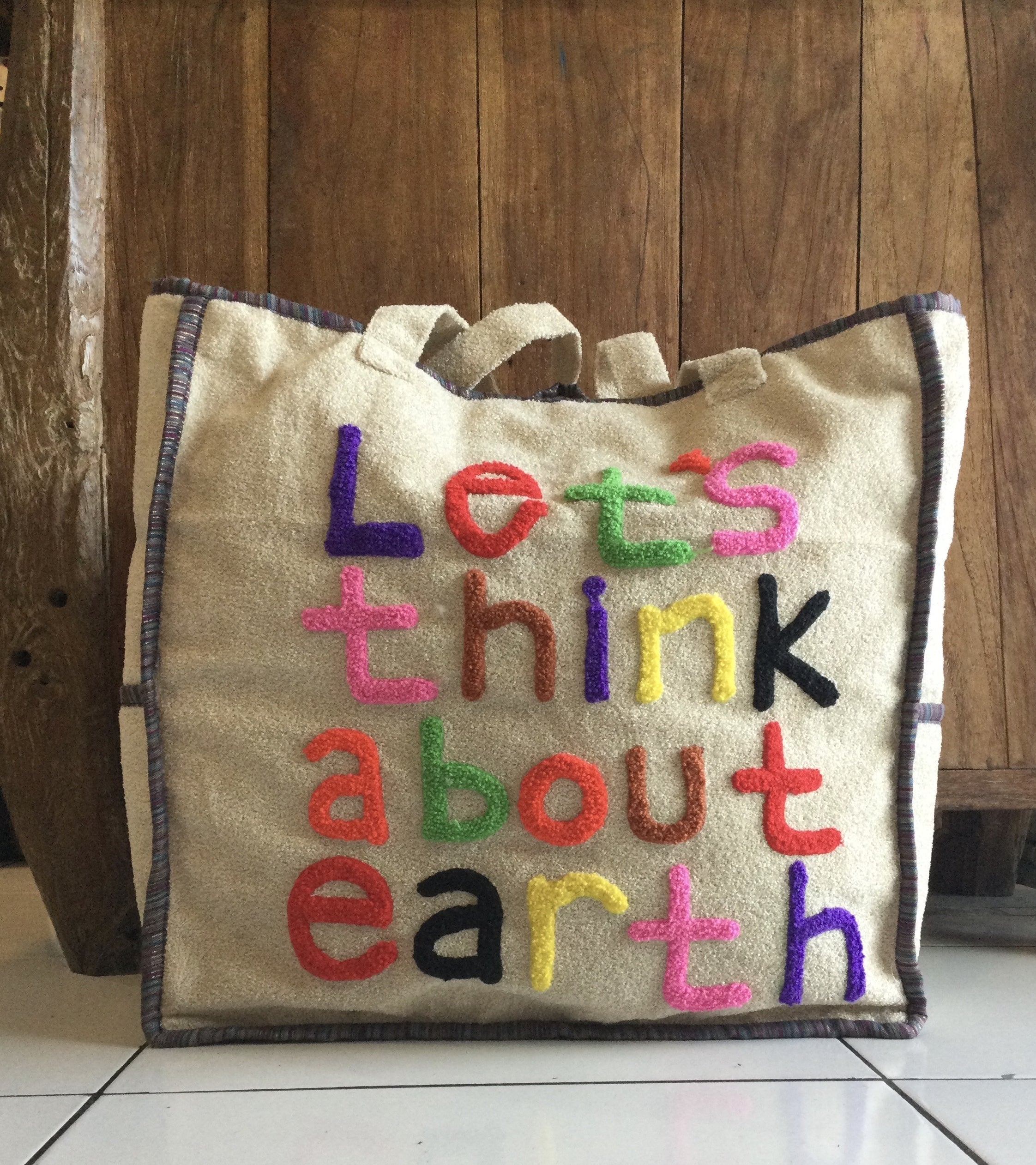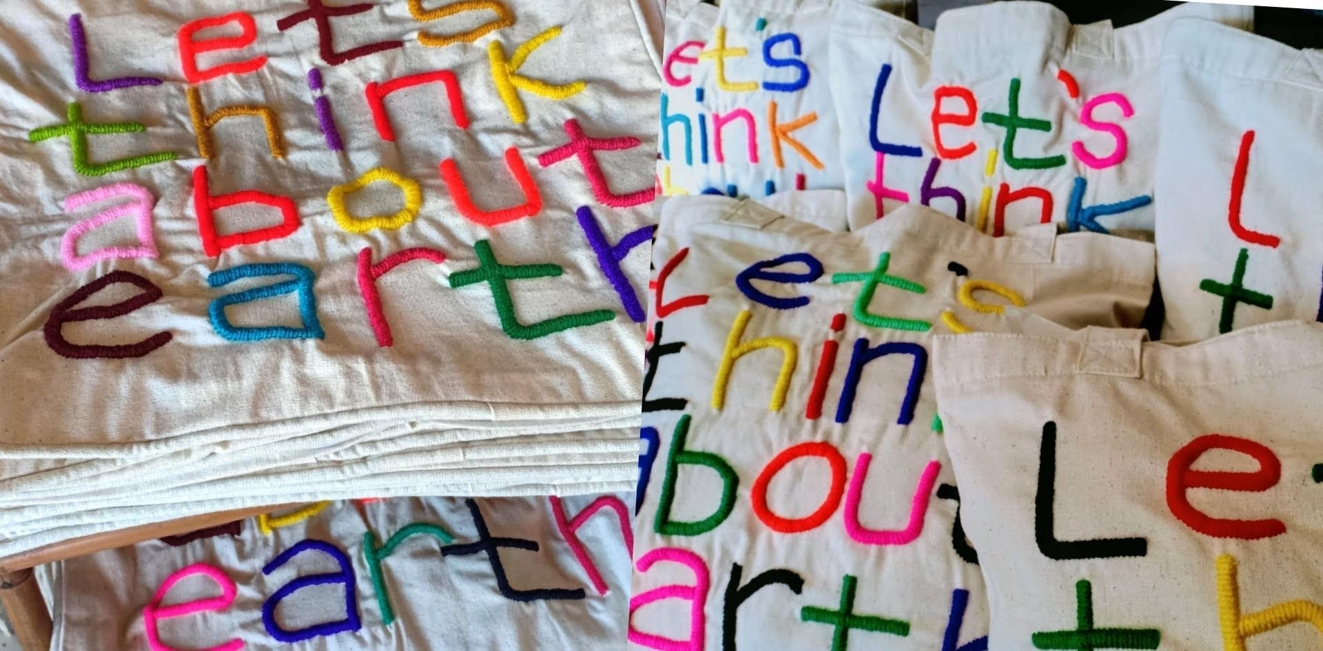 オーナーのメッセージ (Let’s think about earth) が込められたカラフルな刺繍で施されたバッグを手にした時、作り手の温かみが感じ伝わってきました。