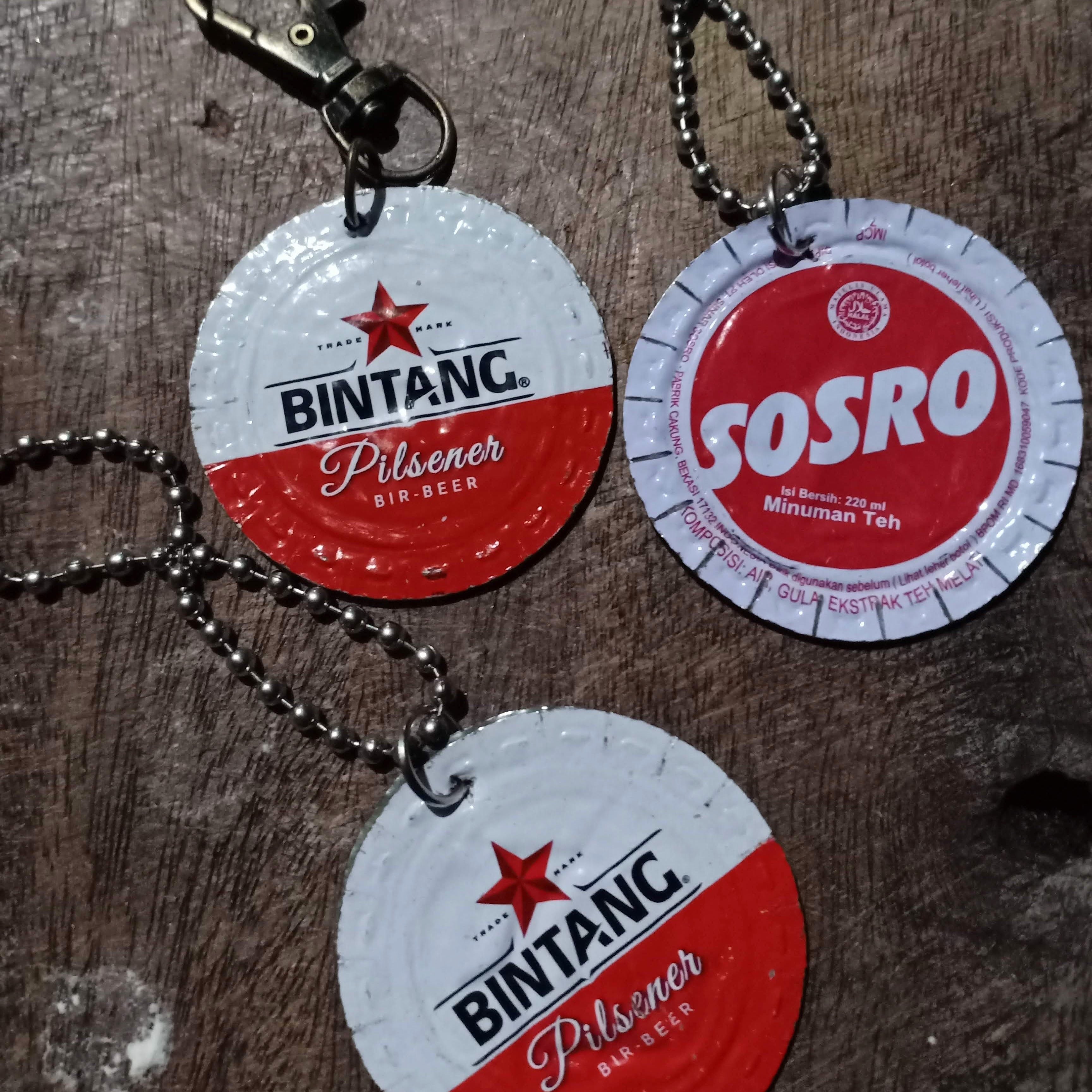 キーホルダーは資源リサイクルでインドネシアのビンタンビールとティーボトル瓶の蓋をリメイクし制作したものです。