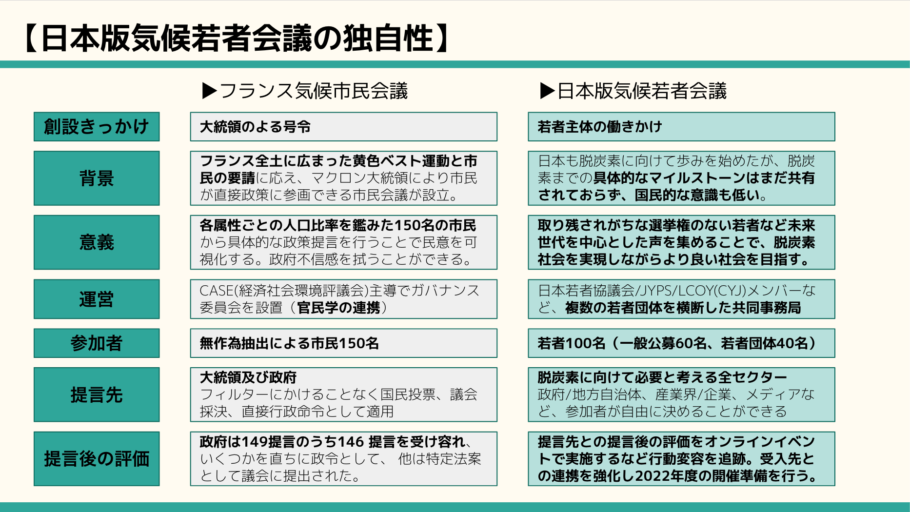 気候変動に対して対策や意識の醸成が進んでいるイギリスやフランスでは政府主導で、無作為に抽出した市民が気候変動対策について話し合う「気候市民会議」が行われました。そこで日本若者協議会では、全国から若者のを集め、日本の気候変動政策について対話する場を作るべくこの度『日本版気候若者会議』を開催する運びとなりました。