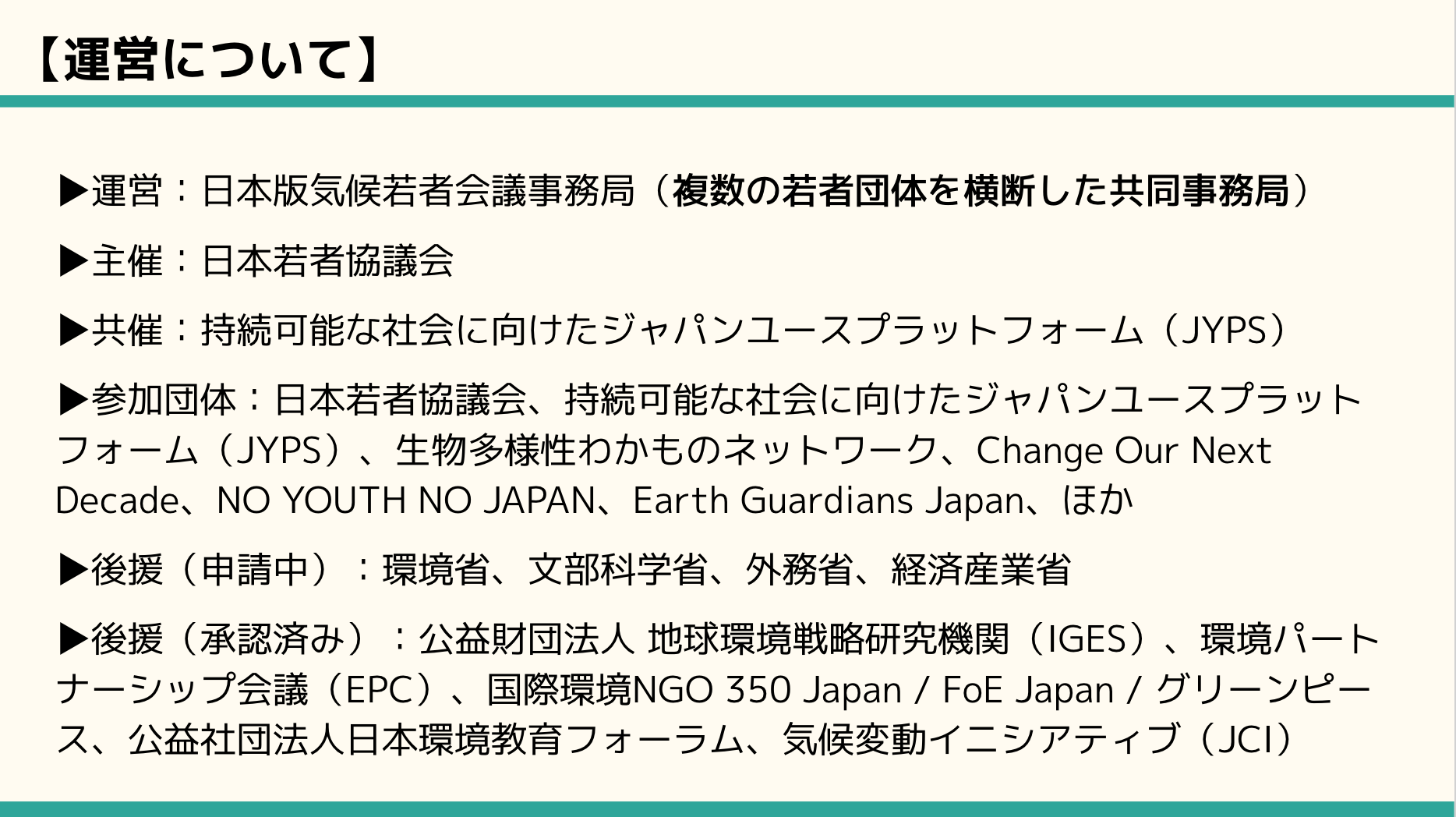 「日本版気候若者会議」は、気候変動やそれに関わる社会構造の問題をどう解決するのか、若者同士で自ら考え、取り残されがちな若者の声を可視化し、社会に問いかける新しい仕組みです。未来世代の声が響かない社会では、より良い未来はあり得ません。この新しい仕組みを社会実装するためにも、日本人一人一人の環境問題・気候変動問題に対する意識向上のためにもご協力どうぞよろしくお願いします。
