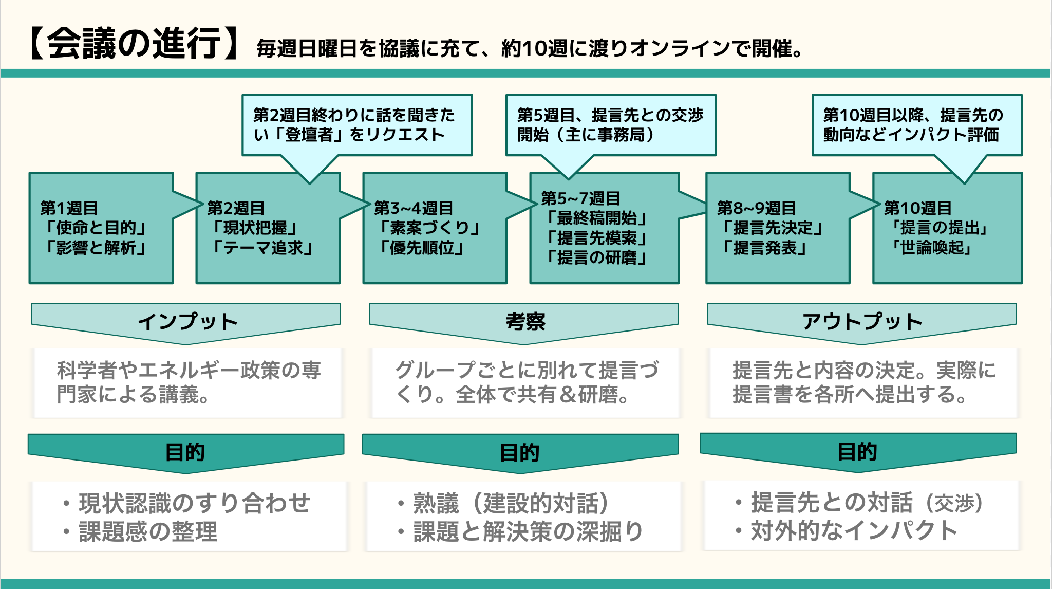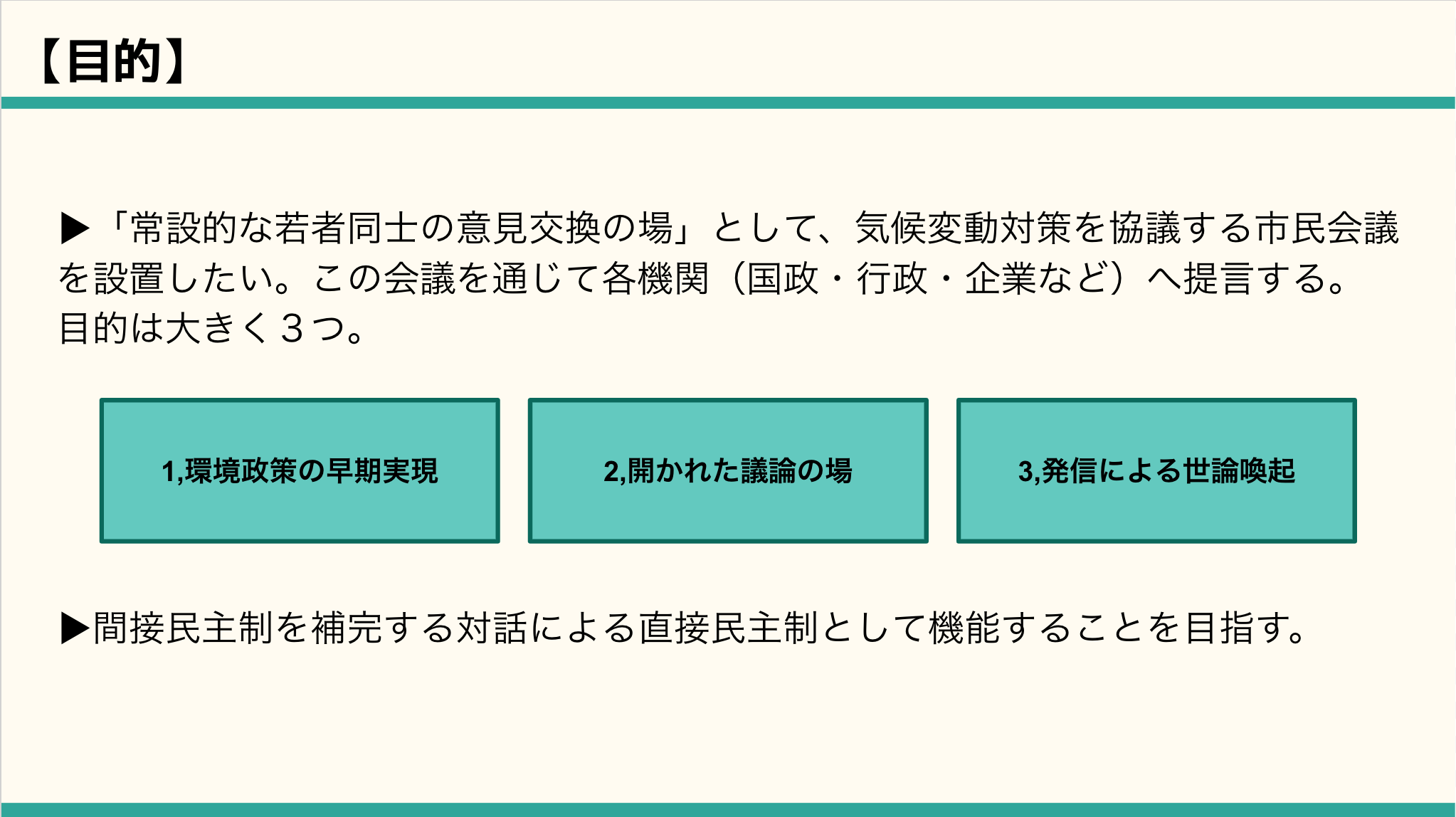 環境政策の早期実現を目指し、各機関(国政・行政・企業など)へ解決策を提言すること、そして、気候変動に対する意識醸成を目的とした世論喚起を最終的なゴールに見据えています。