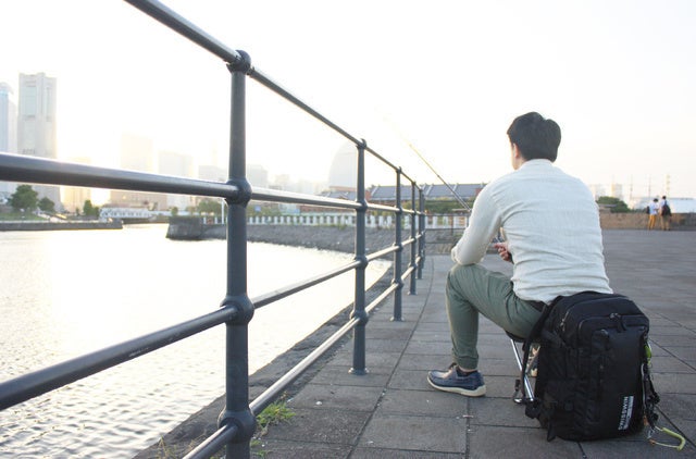 バッグにタックルを詰め込みポイントへ、椅子に座り仕掛けを準備、キャストしたらあたりを待つだけです。ベストポジションの場所取り時にも椅子に座って待てます。