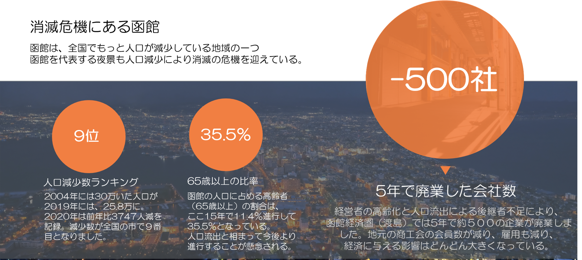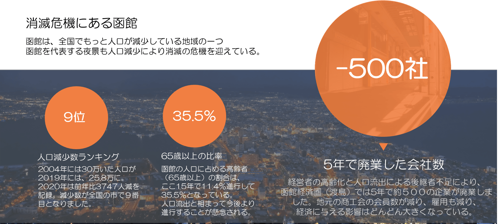 しかし、その裏で暗いニュースもたくさん聞きました。イカの記録的大不漁、全国有数の急激な人口減少、世界三大夜景の消滅危機。そんなニュースに触れるたび、東京にいる自分に何ができるだろう。いや、函館にいなければできることなんてない。そんな風にごまかしてきました。