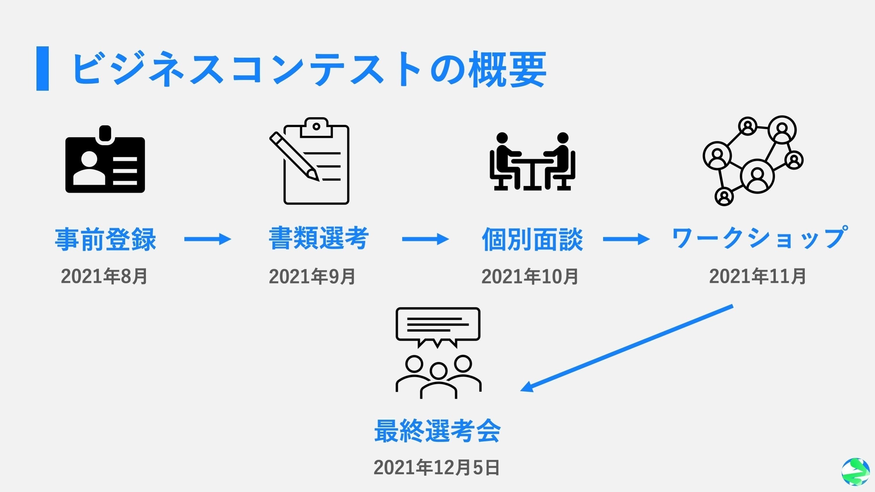 初年度は8月からビジネスコンテストの事前登録を開始し、2021年12月5日(日)16:00〜オンラインにて最終選考会を実施します。