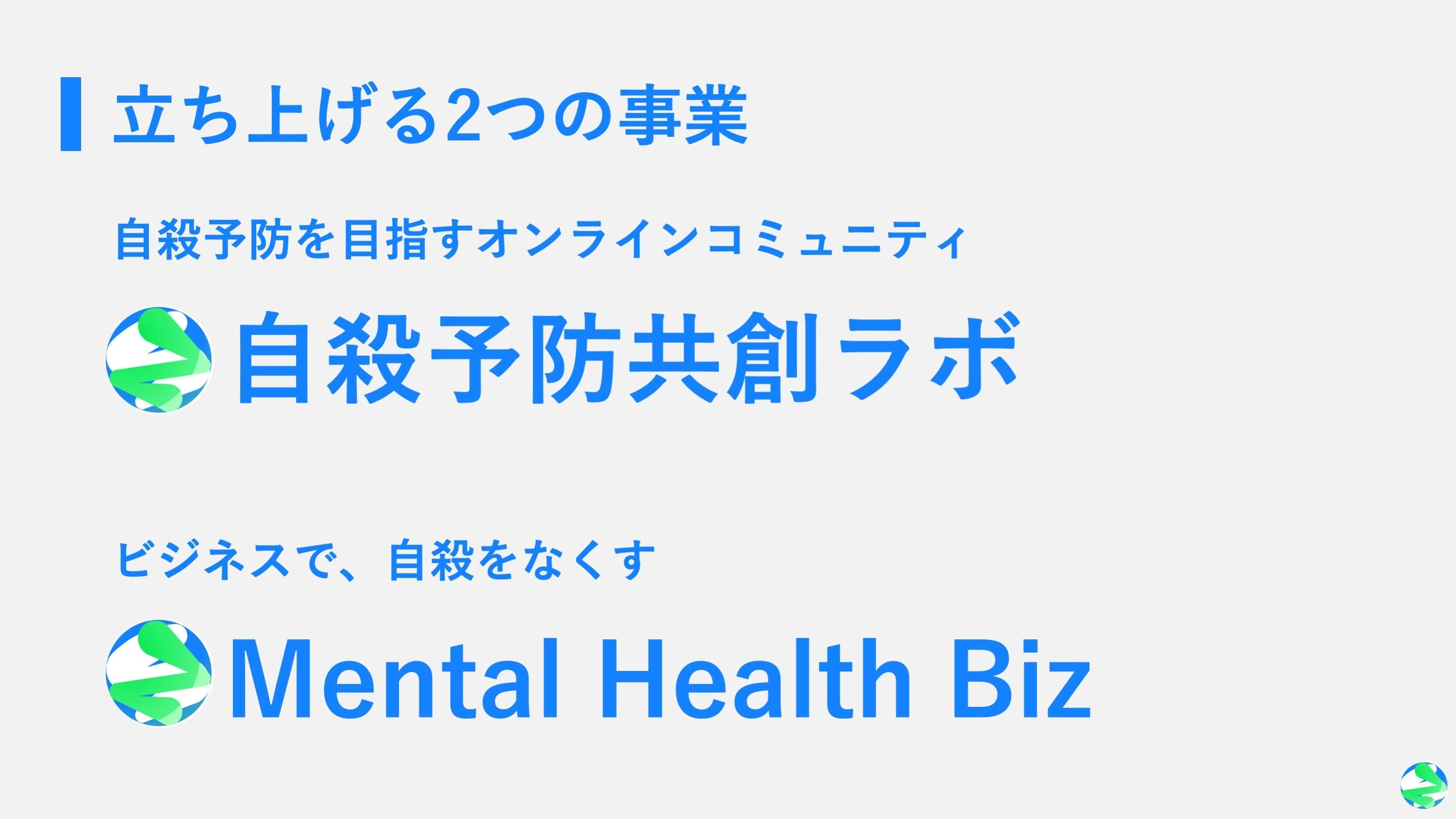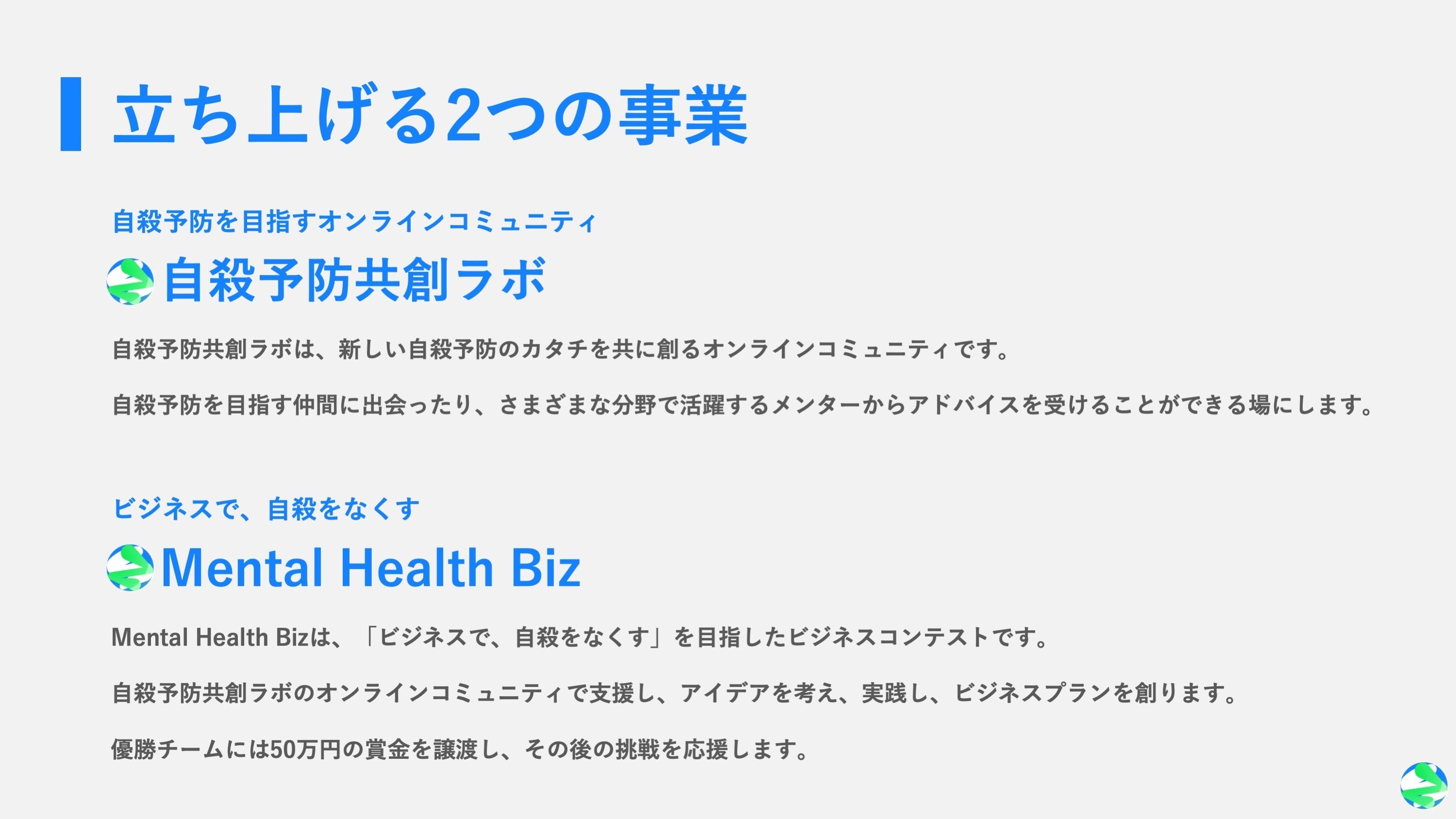 2021年1月から、『自殺予防共創ラボ』という自殺予防を目指した仲間を集めたコミュニティ創りと、『Mental Health Biz』という自殺予防ビジネスコンテストを開催する挑戦をしようと決めて、構想の実現に向けて奔走しています。