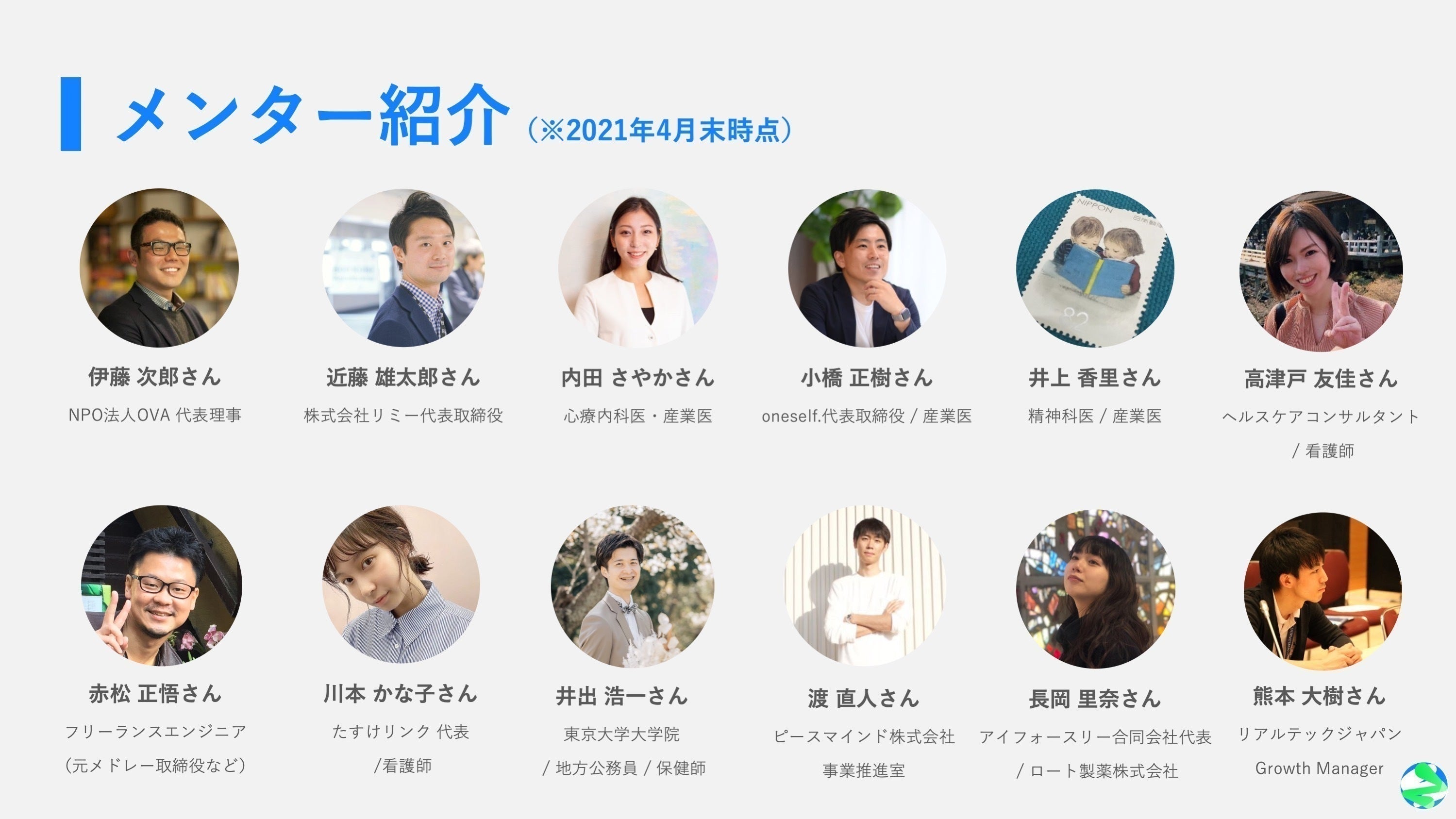このコミュニティが目指すミッションに共感し、自殺予防・自殺対策に向けた挑戦を支援いただけるメンターの方が2021年4月時点で12名おります。
