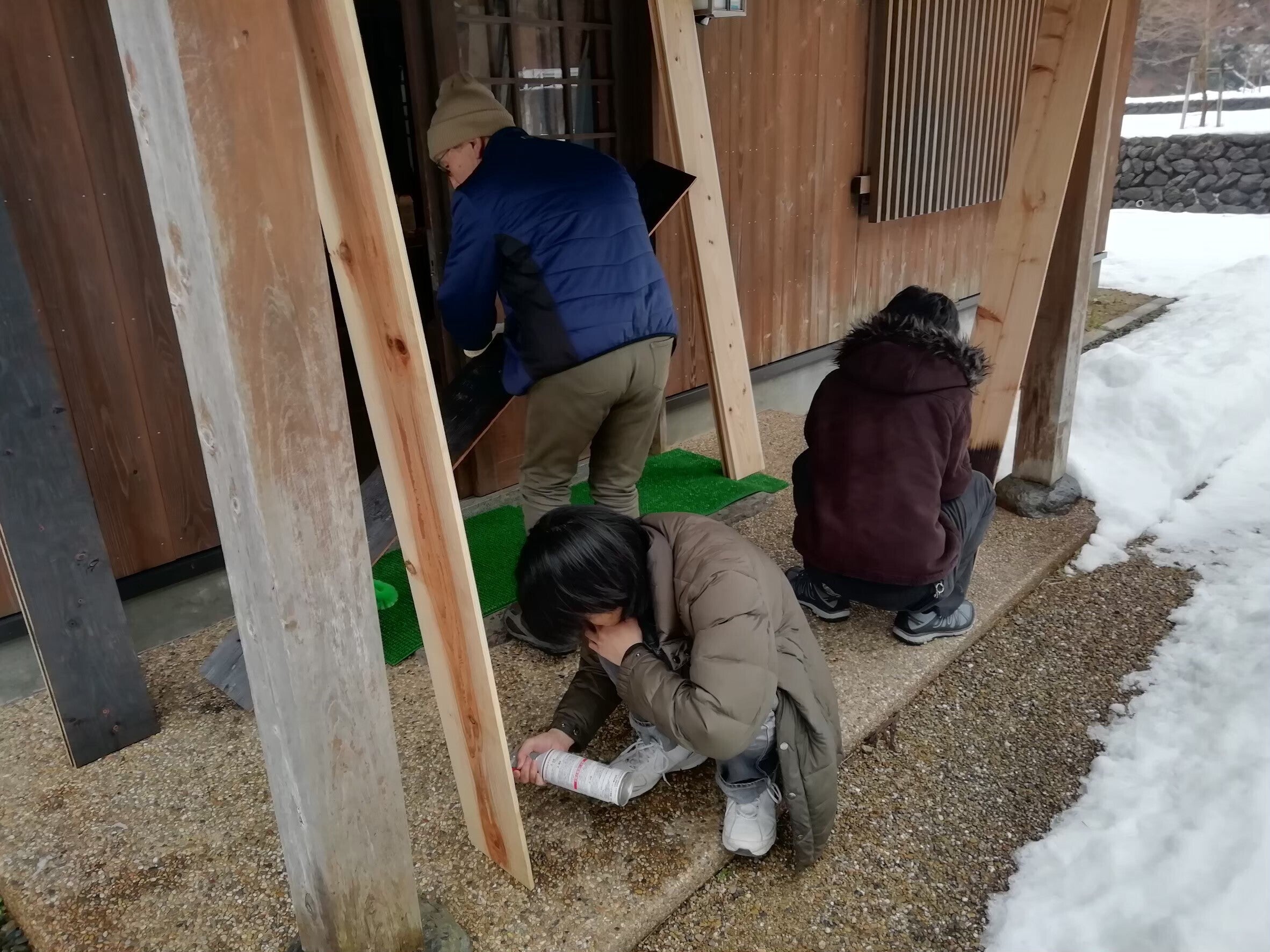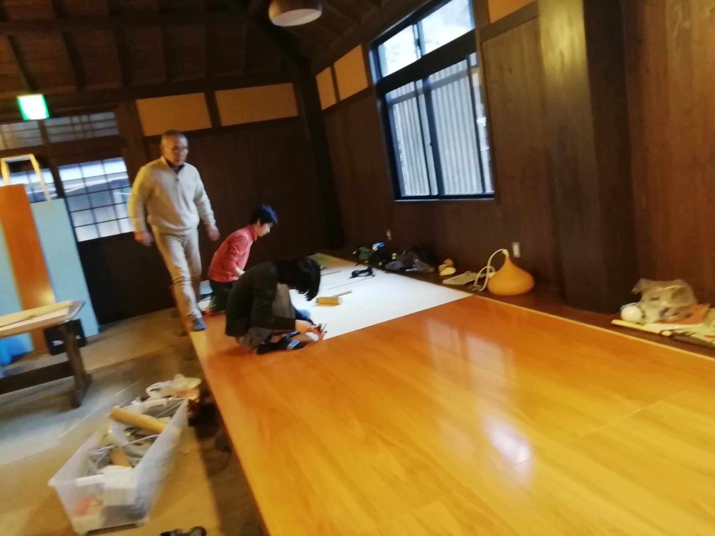 地域の方にアドバイスしてもらいながら、畳をフローリングに張り替える子どもたち