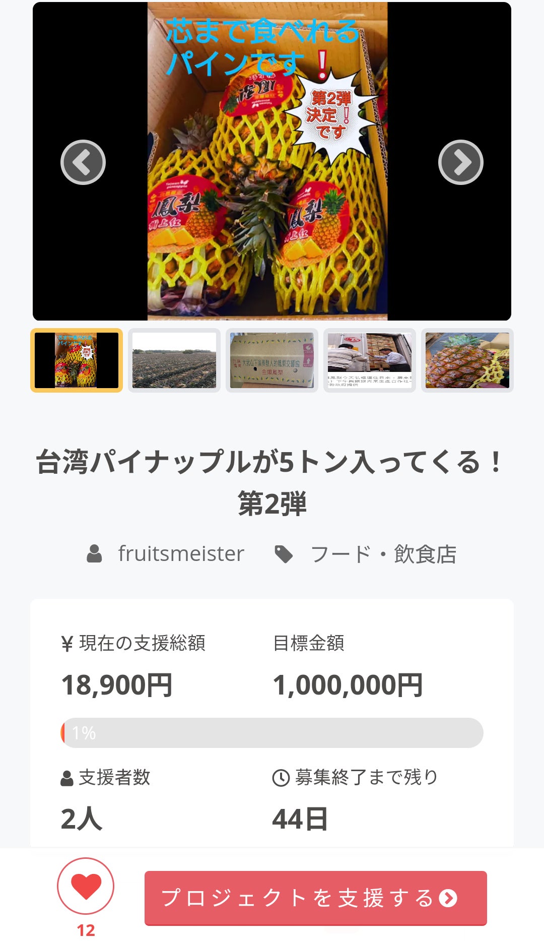2021/05/27 22:22お世話になっております。フルーツマイスターみかん屋です!遂に"台湾パイナップルが入ってくる"の第2段が掲載されました。今回は前回と違い、いきなり来るのではなく季節的に一番良い時期の夏にお届け出来るようにと7月中旬頃に到着予定で計画しております。台湾パイナップルの旬は4月~7月ということなので今年はこれが最終になると思います。コロナが終息すればすぐにでも台湾まで行き皆様の反応や感想をお伝えしたいのですが、もうしばらく我慢して日本から応援したいと思います。是非前回と同様のご支援や廻りのお知り合いへの拡散をよろしくお願い致します。(^-^) もっと見る台湾パイナップルの第2弾が決定しました!