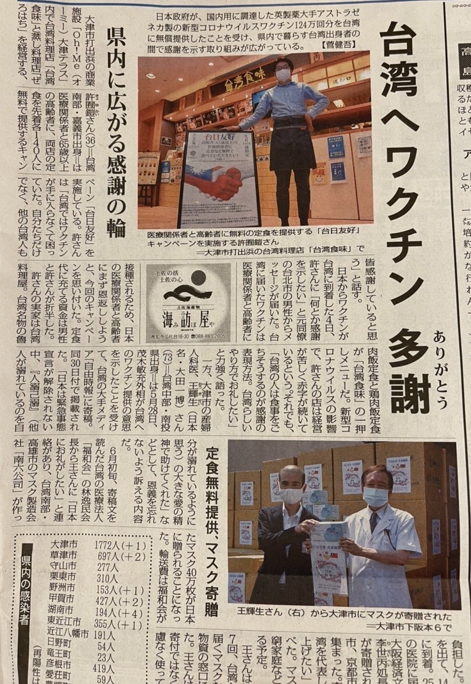 毎日新聞の2021年6月26日に取り上げていただき、このような記事を書いていただきました。「大津市打出浜の商業施設「Oh!Me(オーミー)大津テラス」内で台湾料理店「台湾食味」と蒸し料理店「ぜろはち」を経営する、許囿鎧(きょゆかい)さん(36)=台湾南部・嘉義市出身=は医療関係者と65歳以上の高齢者に、両店の定食を先着各140人に無料で提供するキャンペーン「台日友好」を実施している。許さんは「台湾ではワクチンが手に入らなくて困っていた。自分たちだけでなく、他の台湾人も皆感謝していると思う」と話す。日本からワクチンが台湾に到着した4日、許さんに「何とか感謝を示したい」と元同僚の台北市の男性からメッセージが届いた。台湾に届いたワクチンは医療関係者と高齢者に接種されるため、日本の医療関係者と高齢者にまず恩返ししようと、今回のキャンペーンを思い付いた。定食代に充てる資金は男性と許さんが折半した。」