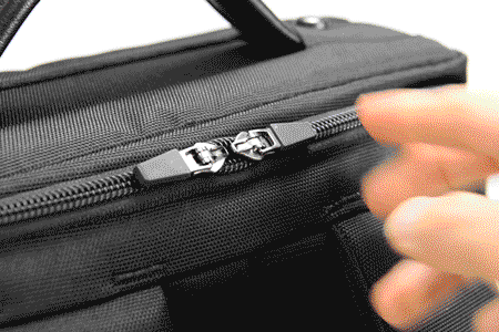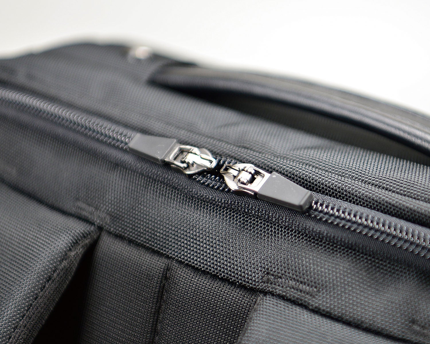 本体メインルームはファスナー開閉式。ファスナーに使用した引き手は、ロック機能の付いたものを使用しています。セキュリティー面を考慮した他、不用意に勝手に開いてしまう事故を避けることができます。また、引き手同士がぶつかり、カチャカチャと不快な音を立てる事もありません。