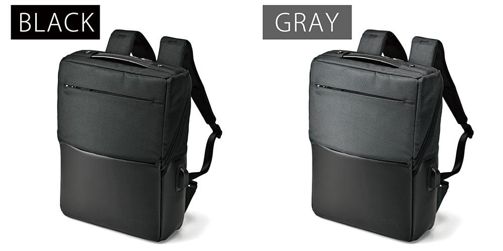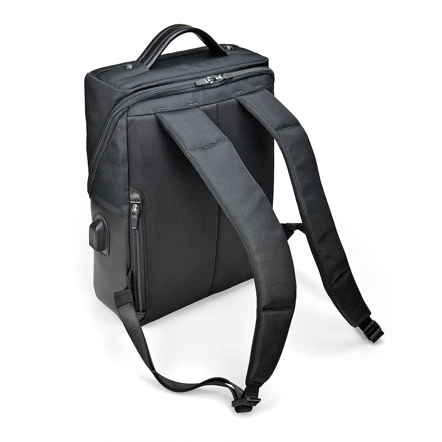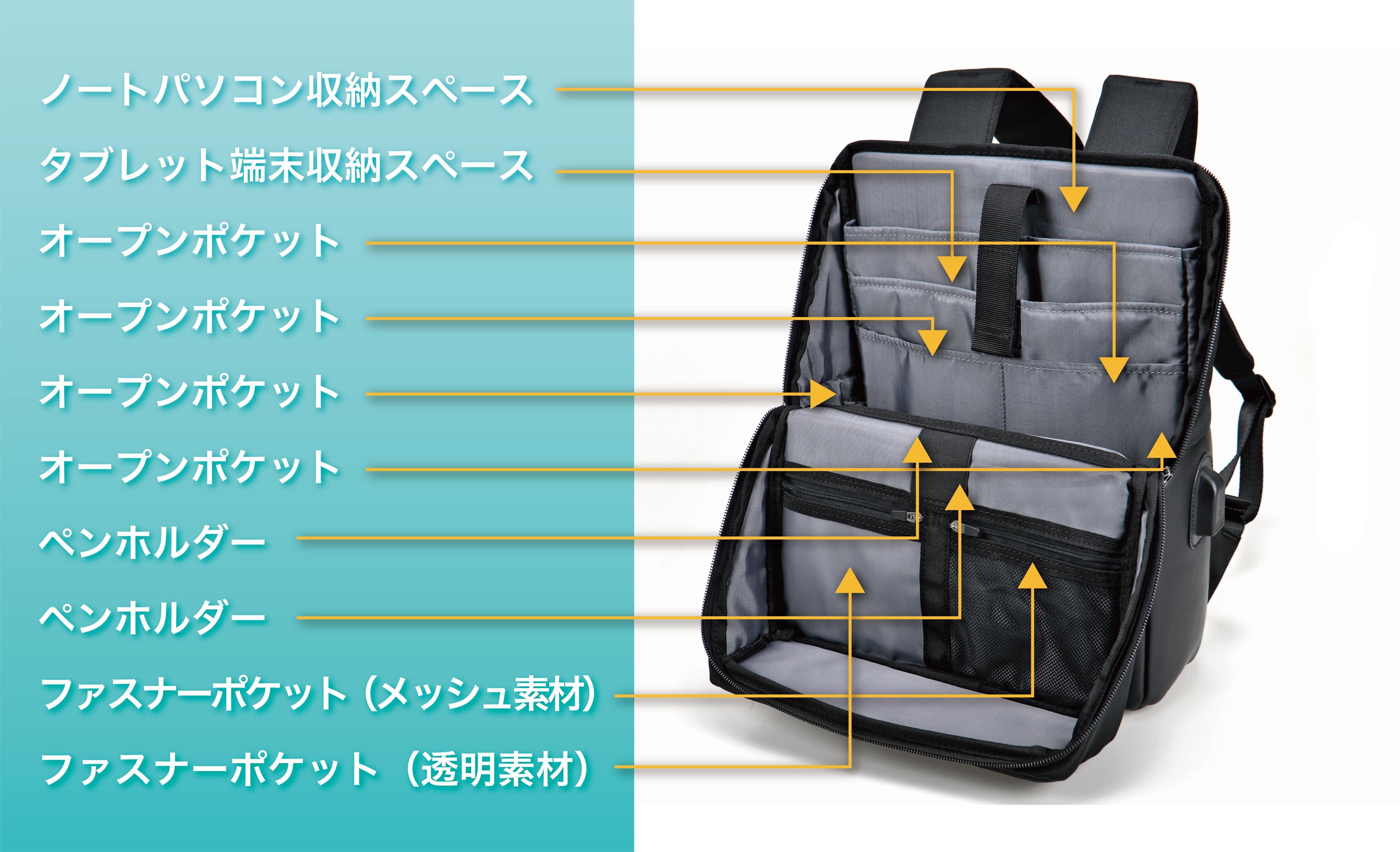 ・仕様:本体開閉=ファスナー式(ダブルファスナー)、本体前胴=ファスナーポケット×1、本体マチ面=USBポート×1、本体上部=ハンドル×1、本体背面=ファスナーポケット×1、肩ベルト×2、・本体内装=ノートパソコン収納スペース×1、タブレット端末収納スペース×1、オープンポケット×4、ファスナーポケット×2、USBケーブル×1(固定式。取り外し不可)
