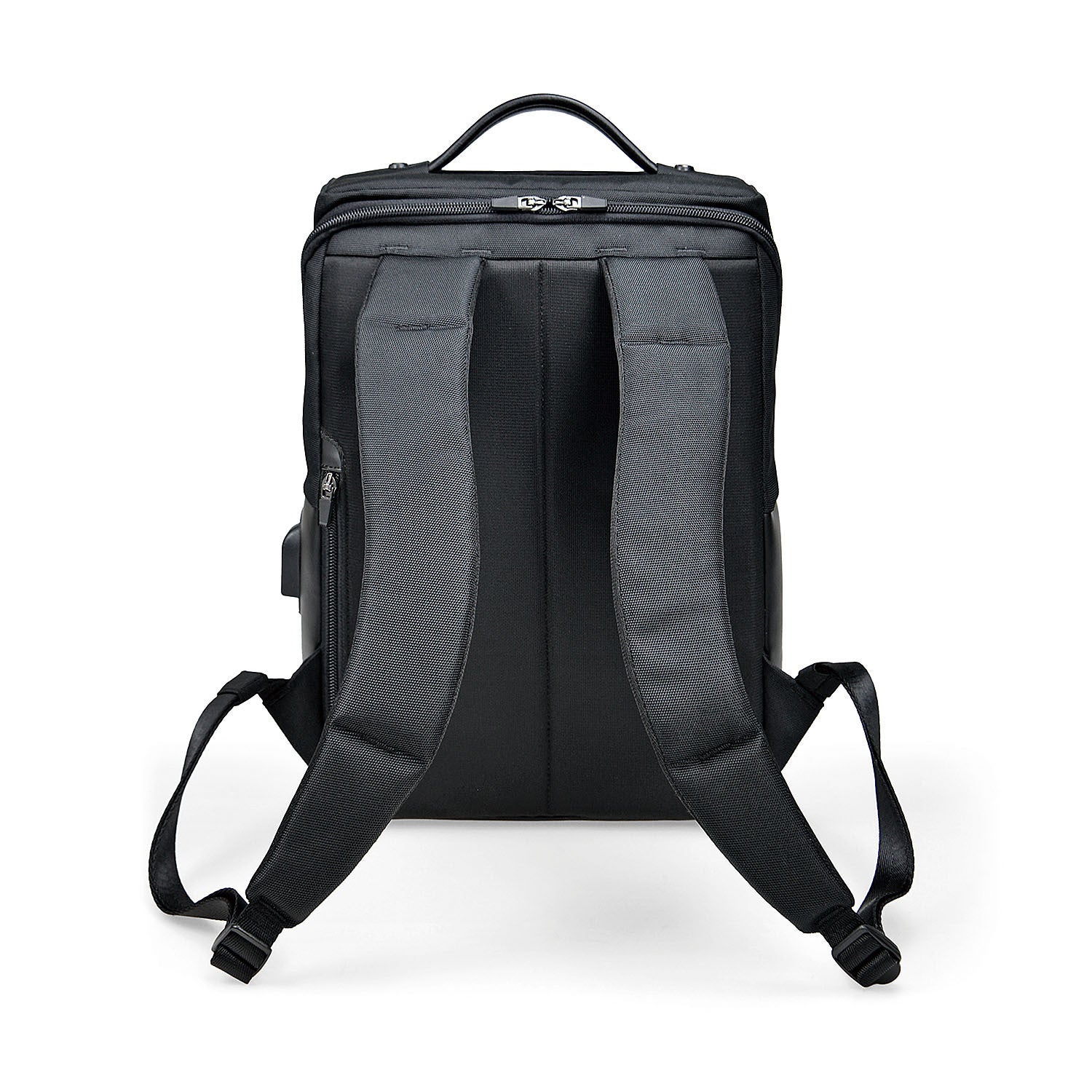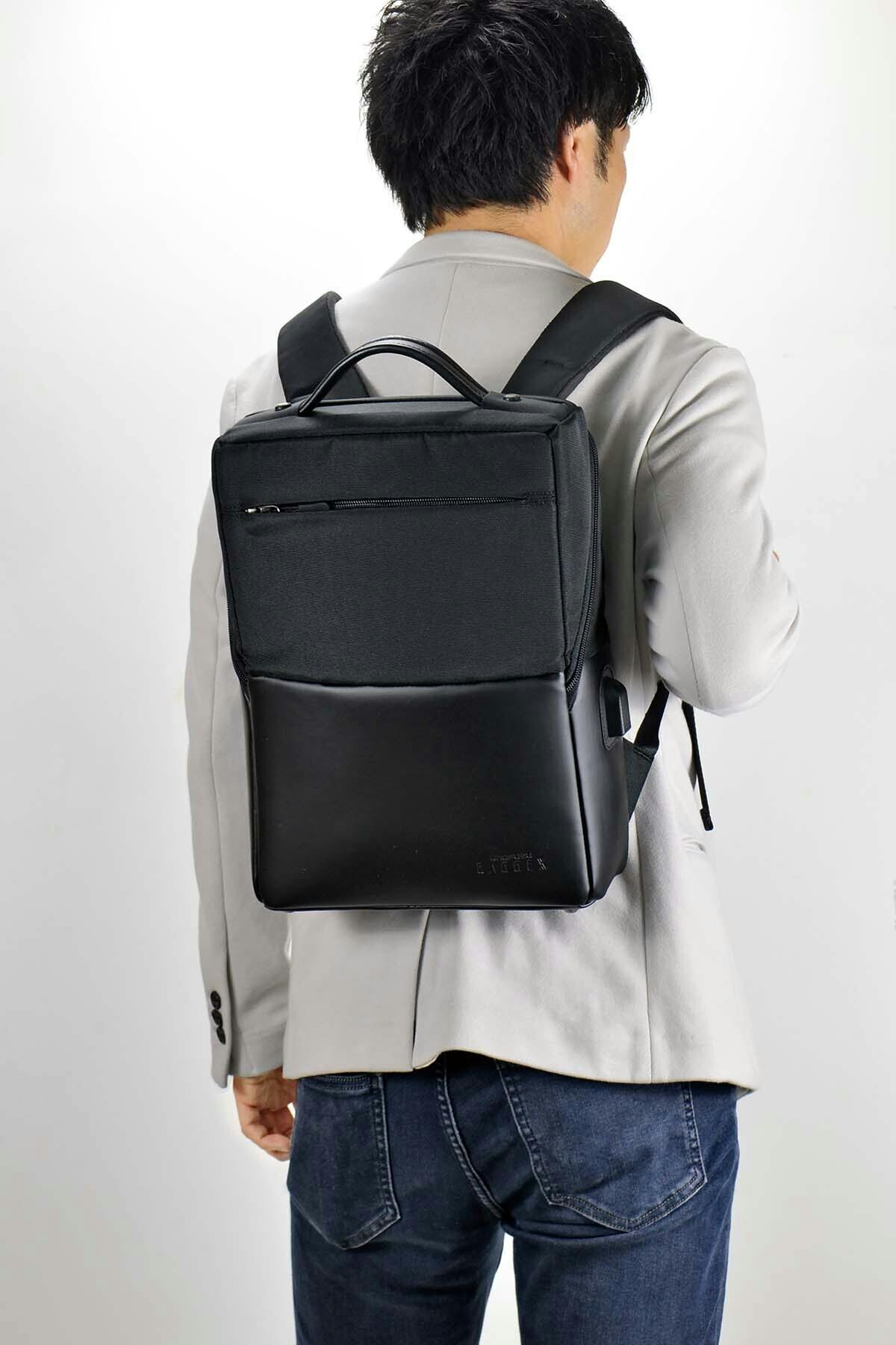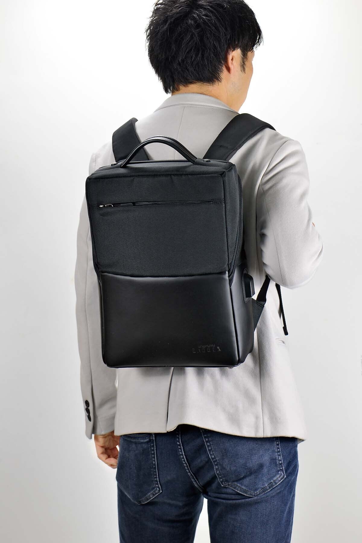 ・仕様:本体開閉=ファスナー式(ダブルファスナー)、本体前胴=ファスナーポケット×1、本体マチ面=USBポート×1、本体上部=ハンドル×1、本体背面=ファスナーポケット×1、肩ベルト×2、・本体内装=ノートパソコン収納スペース×1、タブレット端末収納スペース×1、オープンポケット×4、ファスナーポケット×2、USBケーブル×1(固定式。取り外し不可)