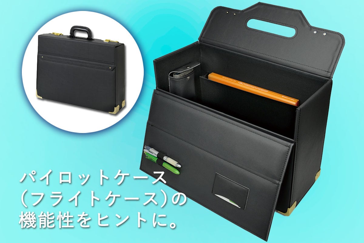 この大きく開く仕様は、パイロットケース(またはフライトケース)と呼ばれるかばんから着想を得ています。パイロットケースとは、その名の通り航空機のパイロットが使用するかばんで、航空図などを入れて座席横に置いて使用します。 狭い操縦席でも中身が取り出しやすいようメインルームの開口部が上部にあり、重ねて閉じる仕様になっています。