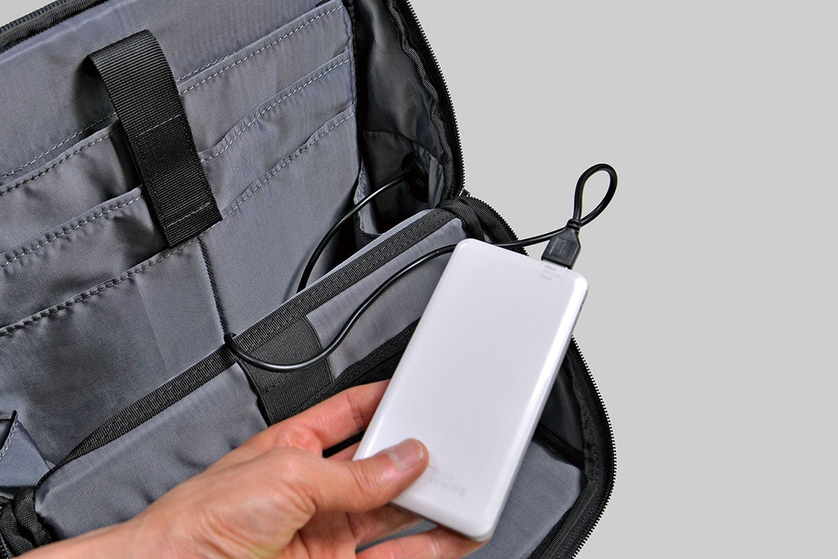 お手持ちのモバイルバッテリーと、バッグ本体内部に装備したUSBケーブルを繋ぎます。