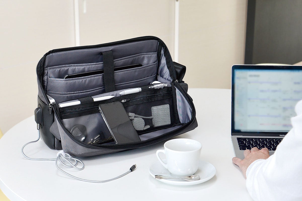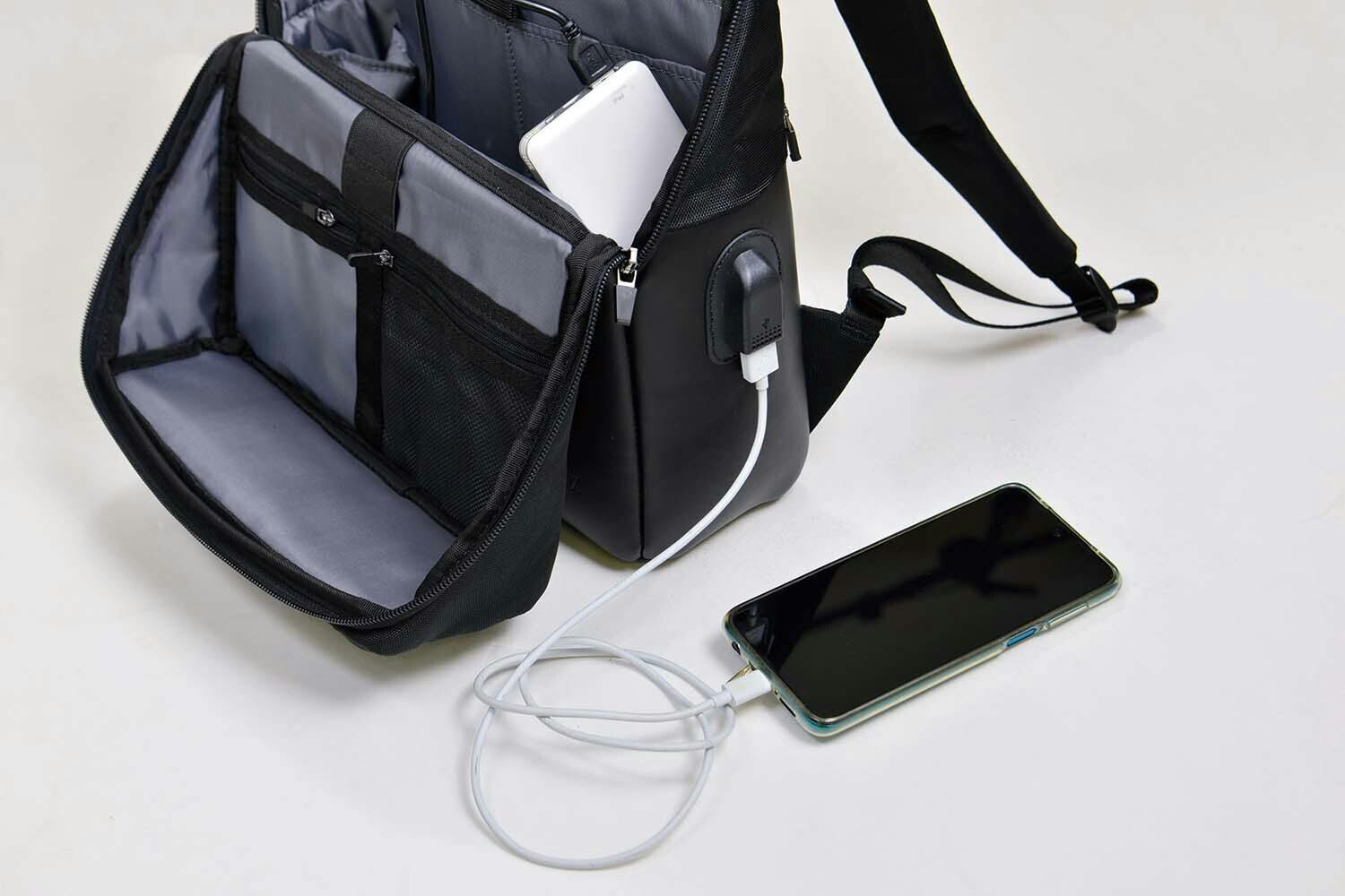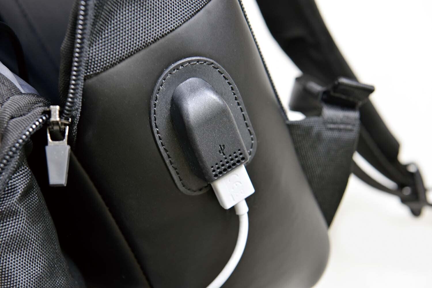 バッグのマチ部分に付いたUSBポートにケーブルを繋ぐ事で充電が可能になります。