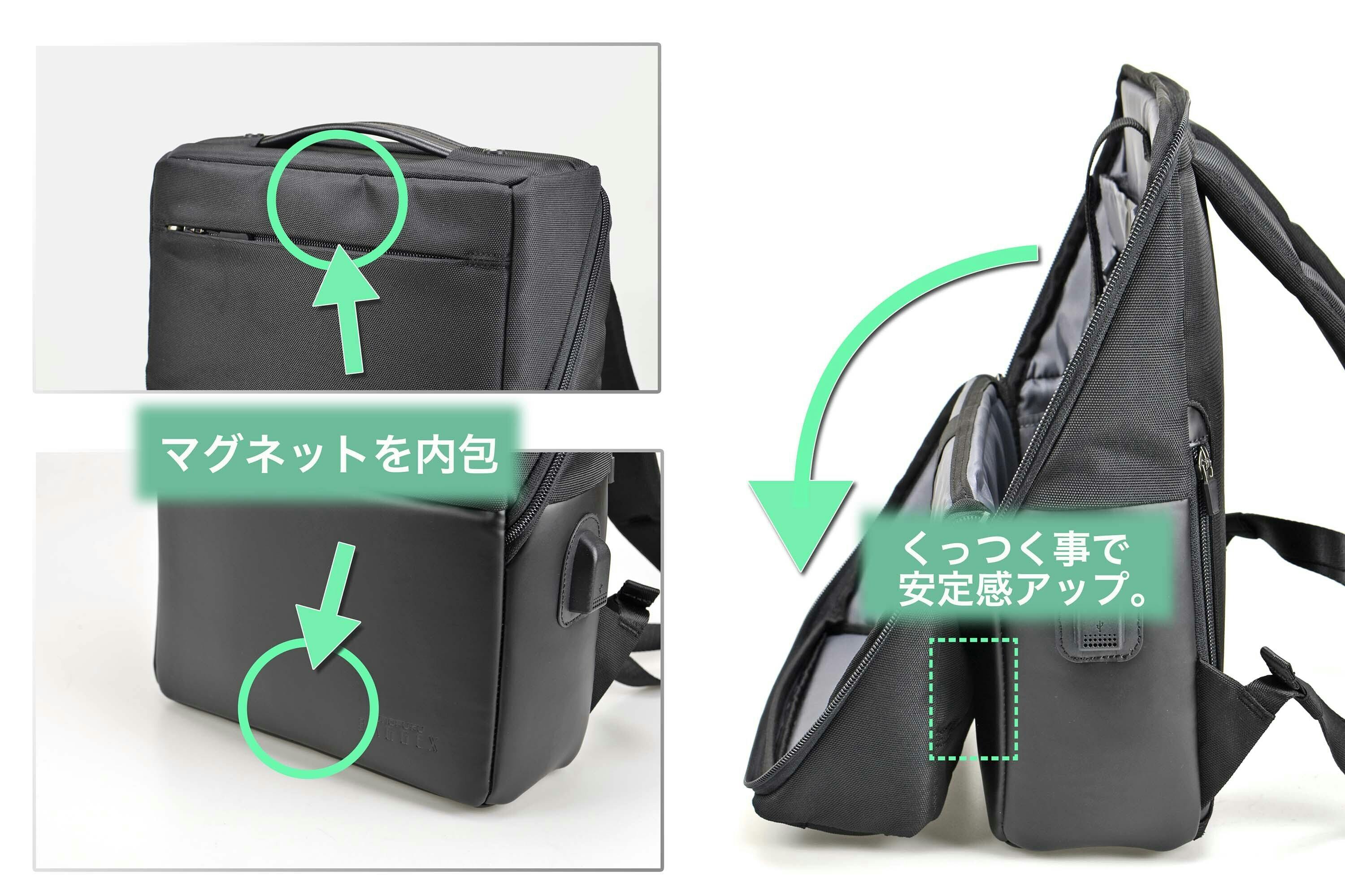 一番の大きな特徴は、ガバッと大きく開く本体メインルーム。荷物がどこにあるか一目でよく分かり、出し入れもスムーズに行えます。また、本体を立てたまま荷物の出し入れができるよう、自立する構造になっています。本体前胴の上部と下部にマグネットを内包し、開いた時に合わさるよう設計。本体の自立性と荷物の出し入れのしやすさを向上させています。
