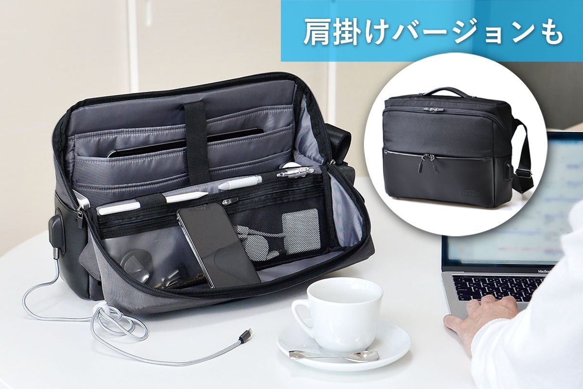・仕様:本体開閉=ファスナー式(ダブルファスナー)、本体前胴=ファスナーポケット×1、本体マチ面=USBポート×1、オープンポケット×1(サイドのファスナーを開けることで、収納スペースアップ)、本体上部=ハンドル×1、肩ベルト×1(着脱不可)、・本体内装=ノートパソコン収納スペース×1、タブレット端末収納スペース×1、オープンポケット×4、ファスナーポケット×2、USBケーブル×1(固定式。取り外し不可)