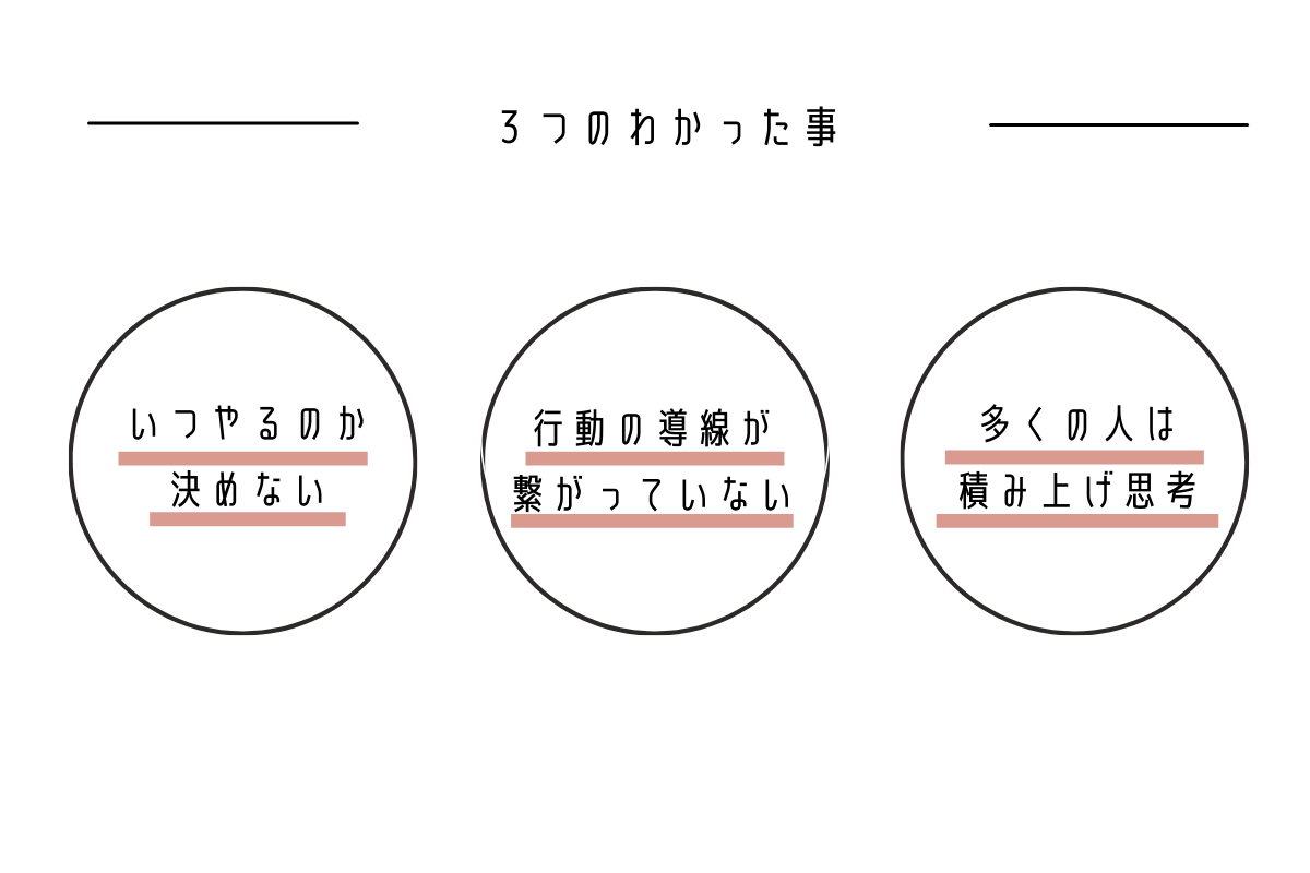 やることのリストアップ自体は大抵の人はできます。しかしそれを何時にやるのか、何の後にやるのか、そこまで決めきらない人が多く、まあいっか、まだいいか、もういいか。と言うように、先送りの思考に陥っていました。