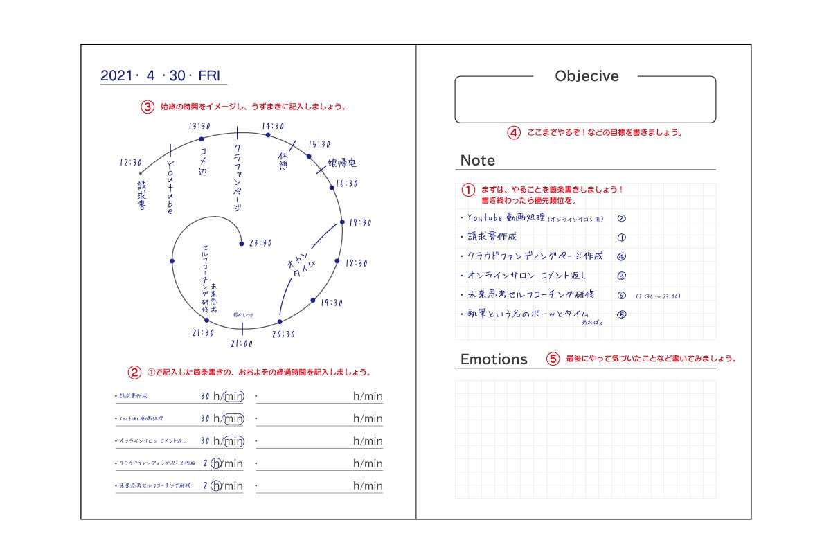うずまきにして、タスクとその脇にやる時間を記入しておくことで、おおよそのかかる時間が予測できるだけでなく、書いた時間で終わらせるように自然と思考が働き出します。結果時間以内に終わらせることができるのです。(お気づきですか?やるまでの一歩がなかなか出ない、も解消されているのです)