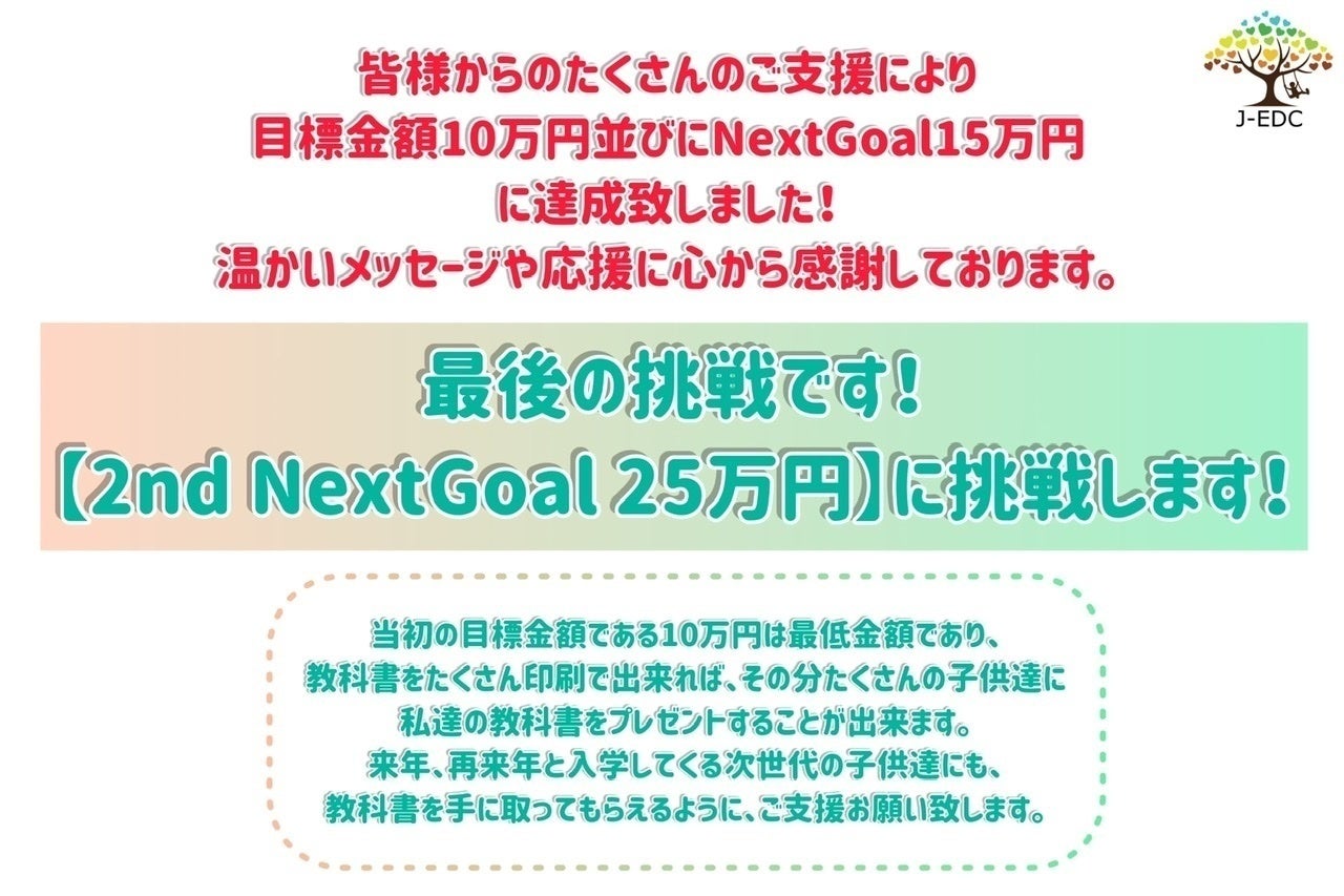 クラウドファンディングの終了日が近づいておりますが、少しでもたくさんの子供達に、質の良い教科書をたくさん届けられるように、2nd NextGoal 25万円に挑戦します!