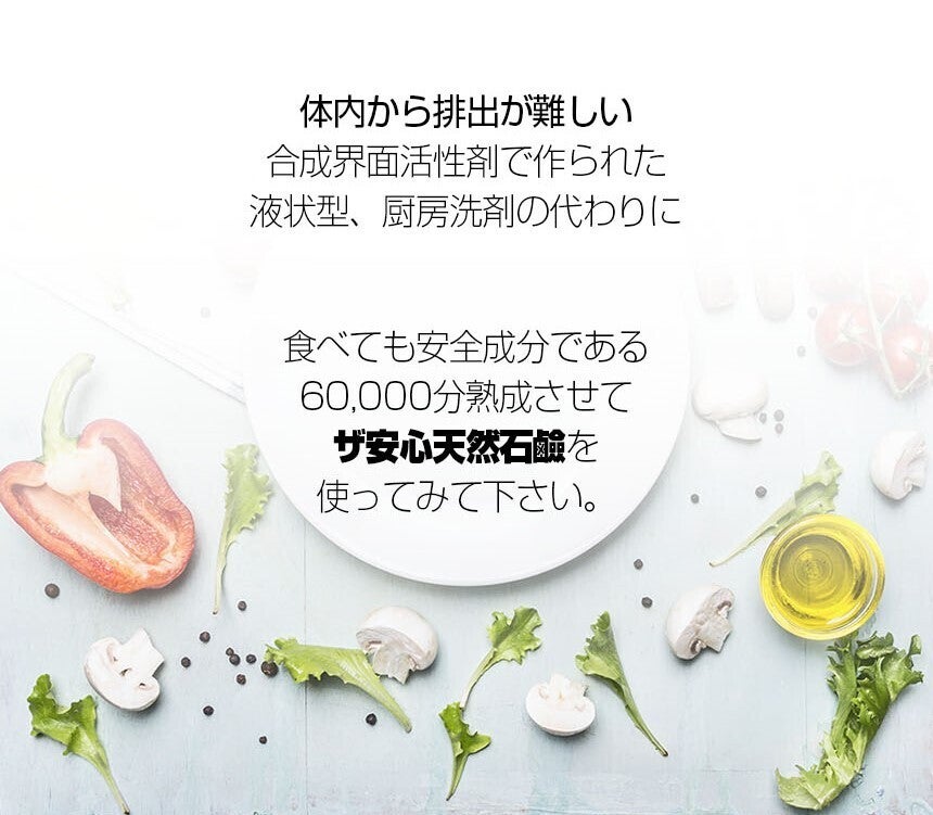 これまで従来の一般的に使用してきた液体、キッチン洗剤は体から排出しにくい合成界面活性剤で作られ、体内から排出しにくく、体に積もっていくことが分かるようになりこういった流れが毎日行われ食べて、食べさせていると思うと不安になってきたのです。