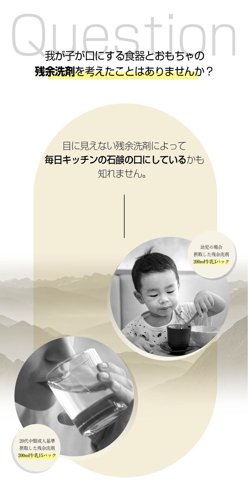 食器はもちろん、赤ちゃんが口によくするおもちゃ、農薬やその他残余物が残っている果物や野菜など何にでも安心して洗うことができます。