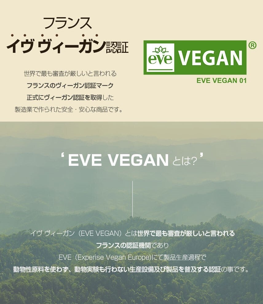 「EVE VEGAN」は世界的にも認められているフランスの認証機関であるEVE(Expertise Vegan Europe)で製品の生産過程で動物性原料を使用せず動物実験をしない生産設備や製品に付与する認証です。