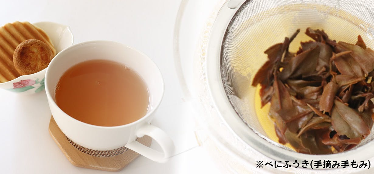 べにふうきの一芯二葉をていねいに摘み取り、機械ではなく手で揉みながら作る茶葉。ダージリン系の気品あるウッディーな香りと穏やかな渋みを持ち、後味には爽快感があります。