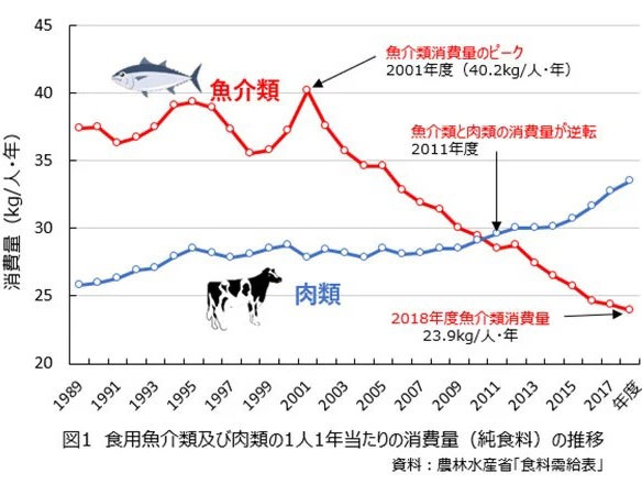 近年、国民の食用魚介類の1人1年当たりの消費量は、平成13年の40.2kgをピークに減少しています。平成23年には肉類の消費量が魚介類を上回り、平成28年には24.6kg(概算値)にまで減少しています(図1)。