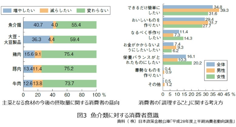 一方で、主菜となる食材の今後の摂取量に関する消費者の意向をみると、魚介類をもっと増やしたいという意識は根強くあります(図3)。そして、消費者の「調理に関すること」に関する調査結果をみると、魚の消費を増やすためには、現代の生活スタイルに合った「できるだけ簡単でおいしいもの」で、健康志向に対応した「栄養バランスがとれたもの」が求められていることがわかります(図3)。
