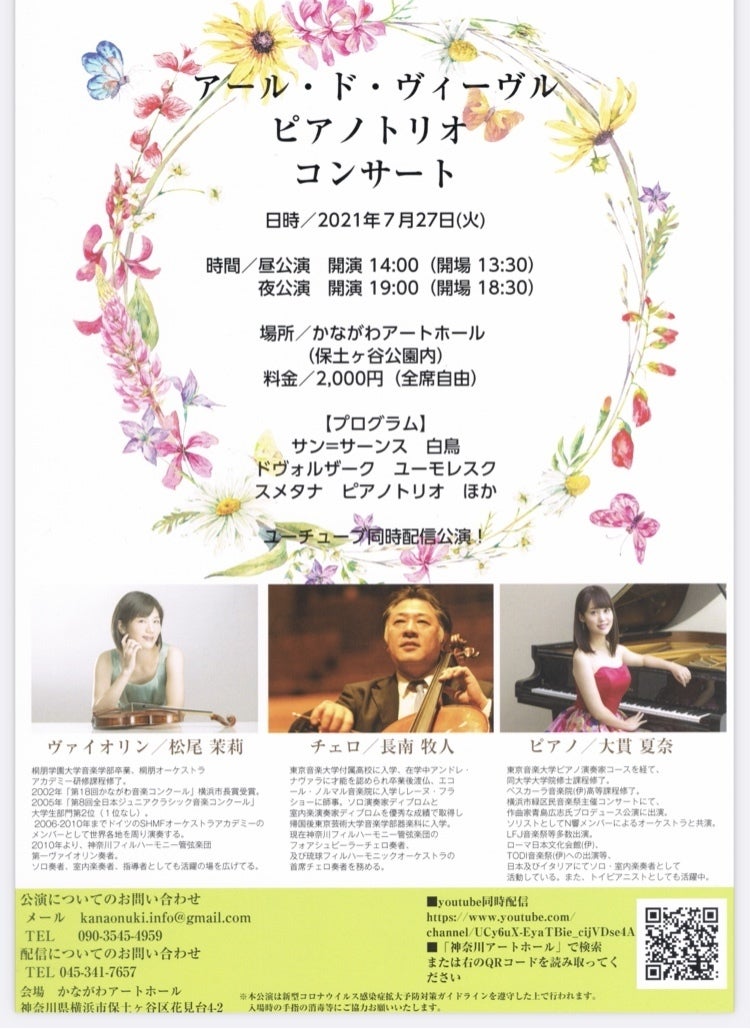 この企画では、昨年度のコロナの影響で中止になった公演を、かながわアートホールのご協力のもとで今年度実現し、皆様に音楽の力を受け取っていただきたいと思っております。コロナが終息してない現在、コンサート会場へ足を運ぶことを躊躇されているお客様に対しては、無料配信する映像により最高の音質と画質をホールからお届けする準備をしております。ヴァイオリン、チェロとピアノのアンサンブルの響きをご堪能いただければ幸いです。