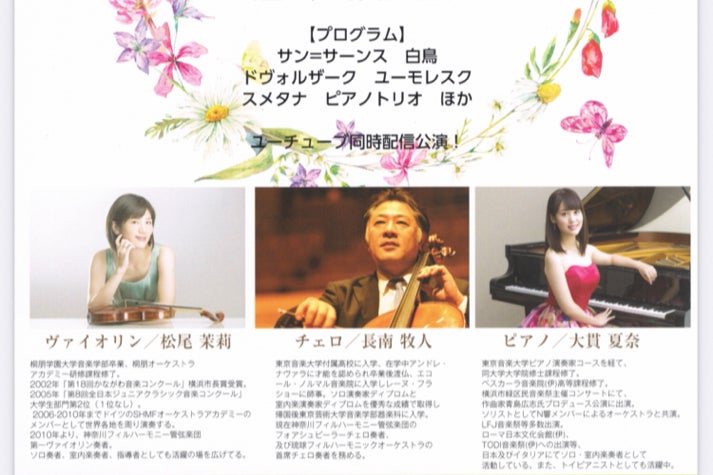 昨年は、チェコと日本が交流100周年という記念の年にあたり、チェコの作曲家スメタナのピアノ三重奏曲をメインにしたコンサートを、楽団の先輩チェリストである長南牧人、緑区民音楽祭の縁で繋がったピアニストである大貫夏奈と共催を予定しておりましたが、コロナのためやむなく中止となりました。気持ちを新たに、スメタナのピアノ三重奏曲をメインにしたコンサートを、同じメンバーで、7月27日火曜日に昼公演14:00-、夜公演19:00-の2回、かながわアートホールにて行い、その模様の同時動画配信も行う運びとなりました。