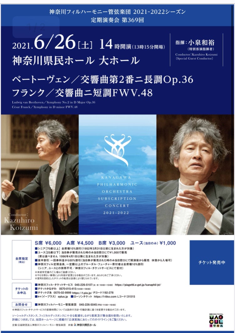 次回の演奏会は7月3日、神奈川県立音楽堂です。今回のコンサートマスター崎谷直人さんによる弾きぶりのコンサートでメインはベートーヴェンの交響曲第5番です。詳細は下記に載せます。