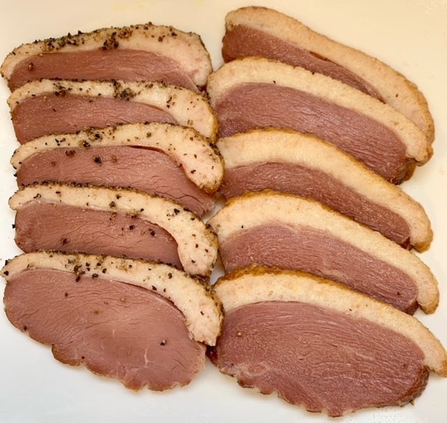 合鴨ローススモーク(燻製)パストラミ(黒胡椒付き)スライス済