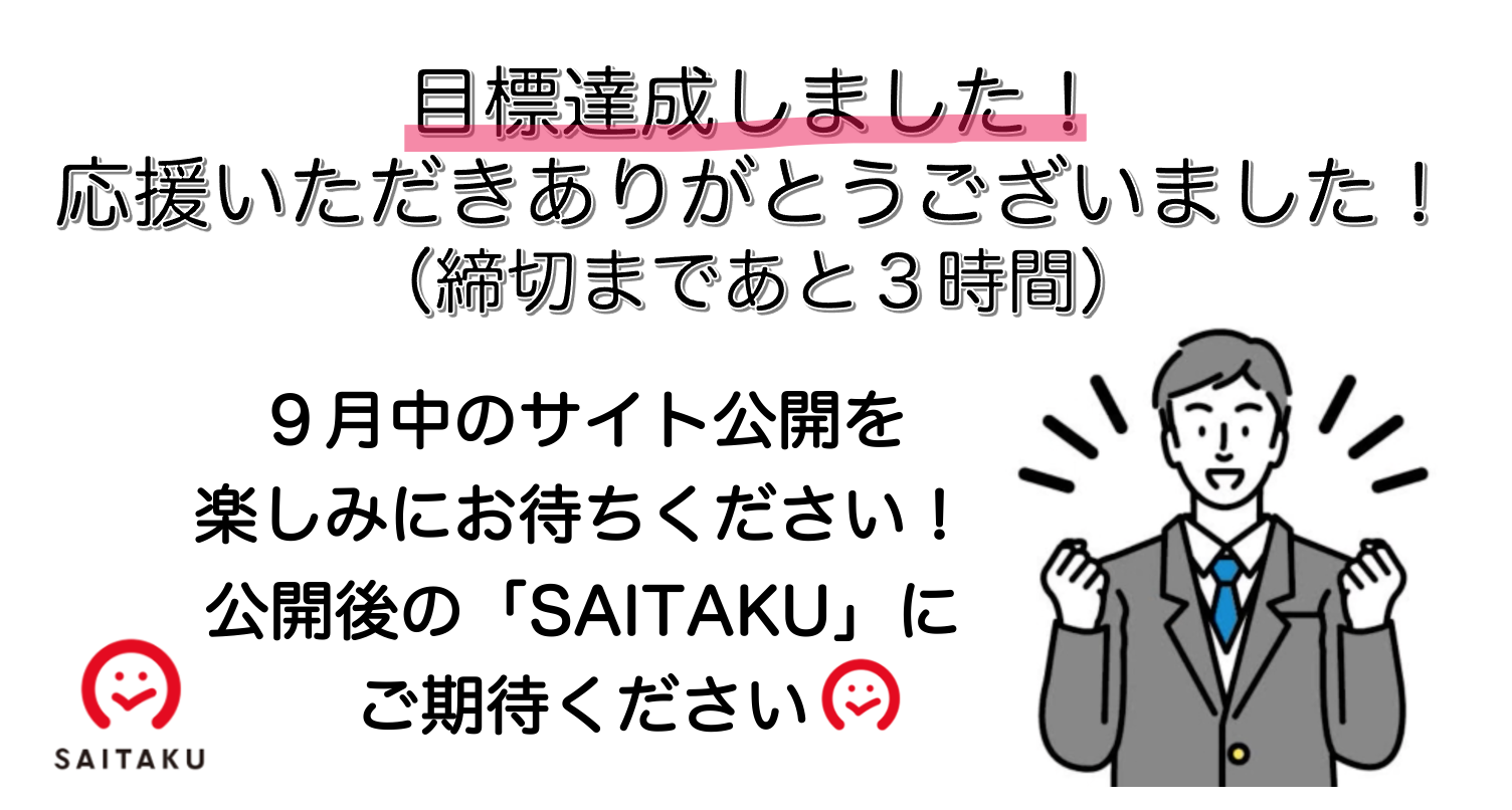 2021/08/30 21:31皆様、応援いただき、有難うございました!終了4時間前、無事に目標達成することができました。これもひとえに応援してくださった皆様のおかげです。重ねてお礼申し上げます。私達にとって、クラウドファンディングはスタートです。今までの補助金、助成金の情報サイトにない、「楽しく学べて申請が出来るようになるコンテンツを提供する」ことをお約束いたします。「どこよりもわかりやすく どこよりも使いやすく どこよりも楽しく、学べる」9月中にサイト公開を行う予定ですので、公開後の「SAITAKU」を楽しみに、もう少々お待ちください。公開までの間、応援してくださった皆様にはメールで随時進捗状況をお知らせいたします!今後ともよろしくお願いいたします。SAITAKU創業メンバー一同 山下 理人 森山 工陛 吉野 美涼 もっと見る