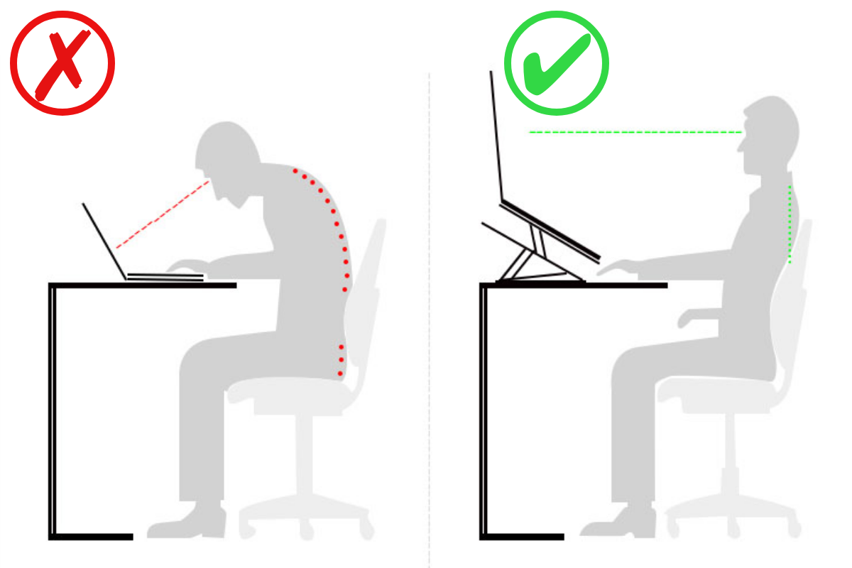 ノートPCを直接デスクに置いて長時間作業を行うと、姿勢が悪くなり首や肩などに負担がかかります。