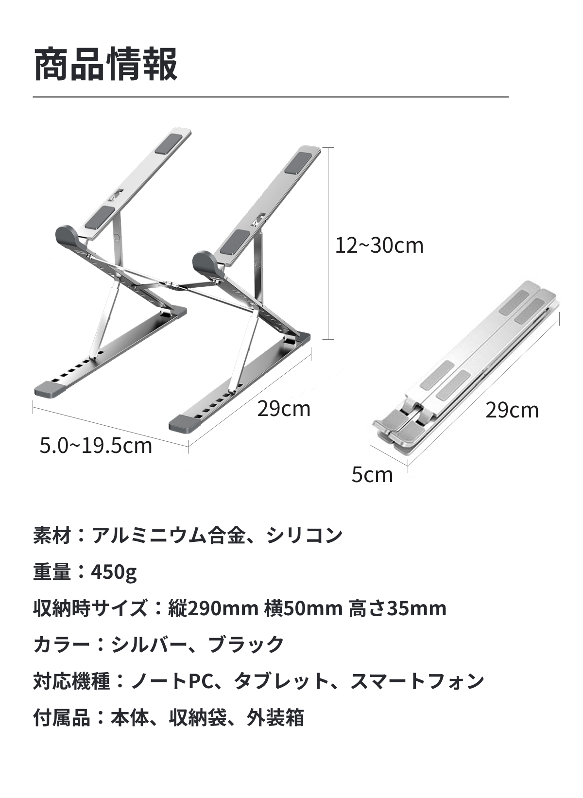A:【大きさ】収納時:縦290 x 横50 x 高さ35 mm、展開時:縦290 x 横195 x 高さ120~300 mm、【重さ】450gです。